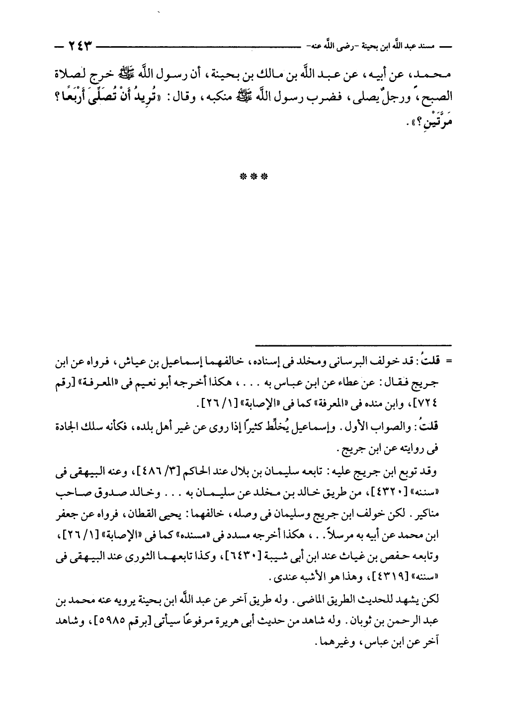محمدٍ، عن أبيه، عن عبد الله بن مالك بن بحينة، أن رسول الله - صلى الله عليه وسلم - خرج لصلاة الصبح، ورجلٌ يصلى، فضرب رسول الله - صلى الله عليه وسلم - منكبه، وقال: "تُرِيدُ أَنْ تُصَلِّىَ أَرْبَعًا؟ مَرَّتَيْنِ؟ ".