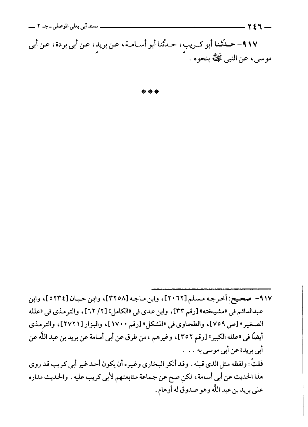 ٩١٧ - حدّثنا أبو كريب، حدّثنا أبو أسامة، عن بريد، عن أبى بردة، عن أبى موسى، عن النبي - صلى الله عليه وسلم - بنحوه.