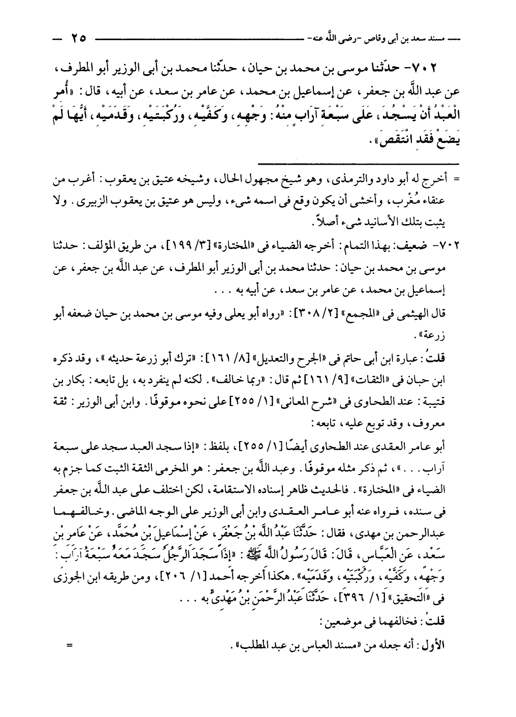 ٧٠٢ - حدّثنا موسى بن محمد بن حيان، حدّثنا محمد بن أبى الوزير أبو المطرف، عن عبد الله بن جعفر، عن إسماعيل بن محمد، عن عامر بن سعد، عن أبيه، قال: "أُمِر الْعَبْدُ أَنْ يَسْجُدَ، عَلَى سَبْعَةِ آرَابٍ مِنْهُ: وَجْهِهِ، وَكفَّيْهِ، وَرُكبَتَيْهِ، وَقَدَمَيْهِ، أَيُّهَا لَمْ يَضَعْ فَقَدِ انْتَقَصَ".