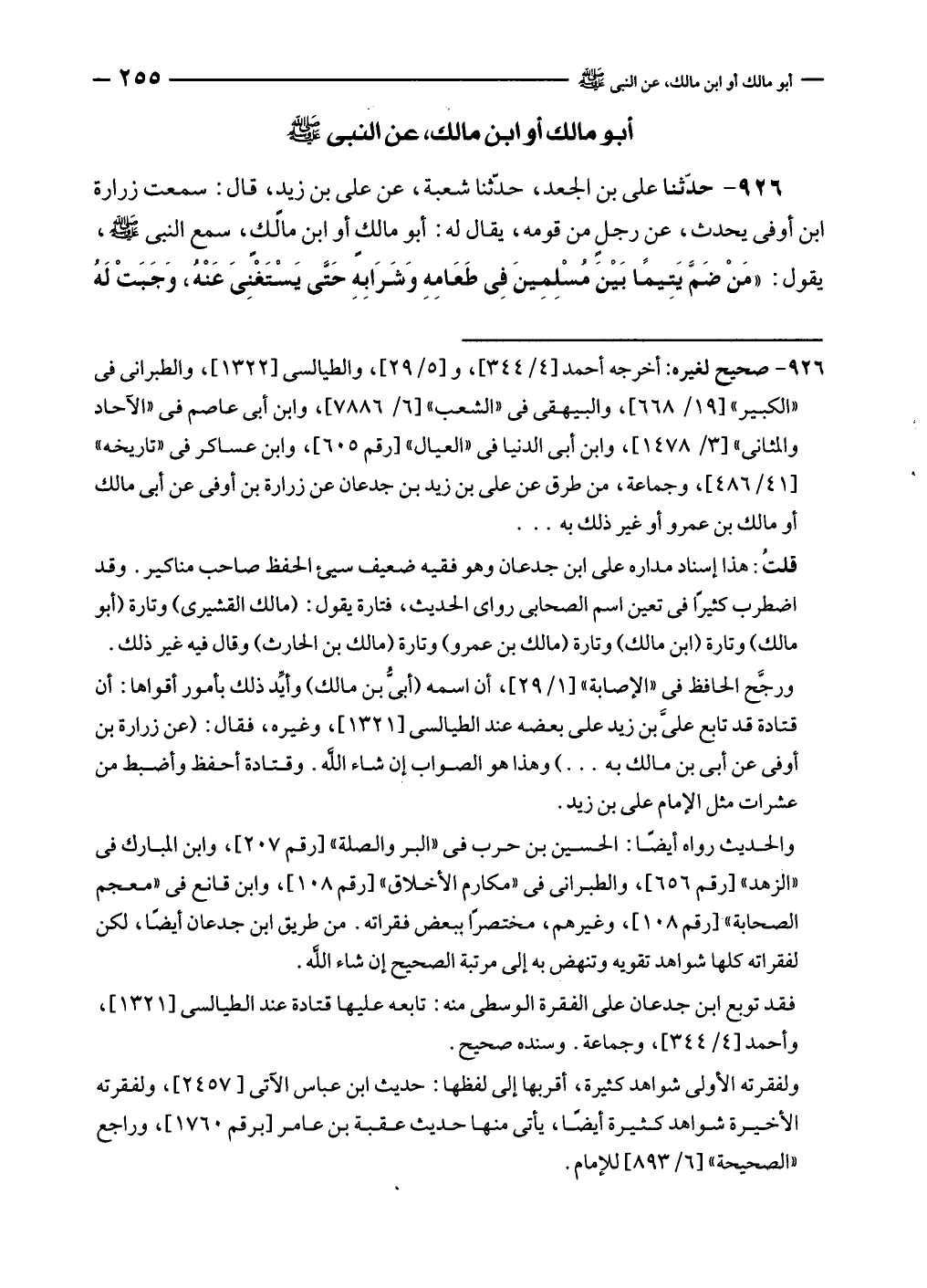 ٩٢٦ - حدّثنا على بن الجعد، حدّثنا شعبة، عن علي بن زيدٍ، قال: سمعت زرارة ابن أوفى يحدث، عن رجلٍ من قومه، يقال له: أبو مالك أو ابن مالك، سمع النبي - صلى الله عليه وسلم -، يقول: "مَنْ ضَمَّ يَتِيمًا بَيْنَ مُسْلِمِينَ فِي طَعَامِهِ وَشَرَابِهِ حَتَّى يَسْتَغْنِىَ عَنْهُ، وَجَبَتْ لَهُ