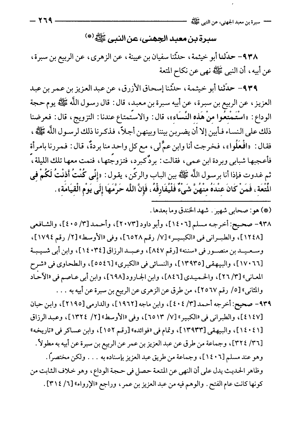 ٩٣٩ - حدّثنا أبو خيثمة، حدّثنا إسحاق الأزرق، عن عبد العزيز بن عمر بن عبد العزيز، عن الربيع بن سبرة، عن أبيه سبرة بن معبدٍ، قال: قال رسول الله - صلى الله عليه وسلم - يوم حجة الوداع: "اسْتَمْتِعُوا مِنْ هَذهِ النِّسَاءِ"، قال: والاستمتاع عندنا: التزويج، قال: فعرضنا ذلك على النساء فأبين إلا أَن يضربن بيننا وبينهن أجلًا، فذكرنا ذلك لرسول الله - صلى الله عليه وسلم -، فقال: "افْعَلُوا"، فخرجت أنا وابن عمٍّ لي، مع كل واحدٍ منا بردةٌ، قال: فمررنا بامرأةٍ فأعجبها شبابى وبردة ابن عمى، فقالت: بردٌ كبردٍ، فتزوجتها، فنمت معها تلك الليلة، ثم غدوت فإذا أنا برسول الله - صلى الله عليه وسلم - بين الباب والركن، يقول: "إِنِّي كُنْتُ أَذِنْتُ لَكُمْ فِي الْمُتعَةِ، فَمَنْ كَانَ عِنْدَهُ مِنْهُنَّ شَىْءٌ فَلْيُفَارِقْهُ، فَإِنَّ الله حَرَّمَهَا إِلَى يَوْمِ الْقِيَامَةِ".
