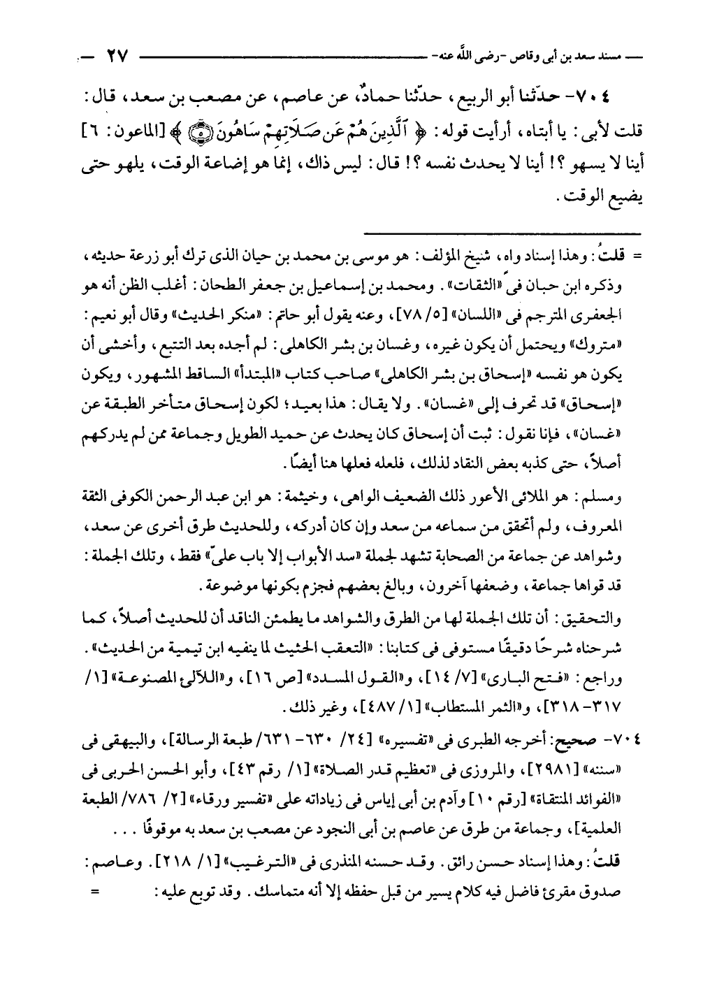 ٧٠٤ - صحيح: أخرجه الطبرى في "تفسيره" [٢٤/ ٦٣٠ - ٦٣١/ طبعة الرسالة]، والبيهقى في "سننه" [٢٩٨١]، والمروزى في "تعظيم قدر الصلاة" [١/ رقم ٤٣]، وأبو الحسن الحربى في "الفوائد المنتقاة" [رقم ١٠] وآدم بن أبى إياس في زياداته على "تفسير ورقاء" [٢/ ٧٨٦/ الطبعة العلمية]، وجماعة من طرق عن عاصم بن أبى النجود عن مصعب بن سعد به موقوفًا. . .