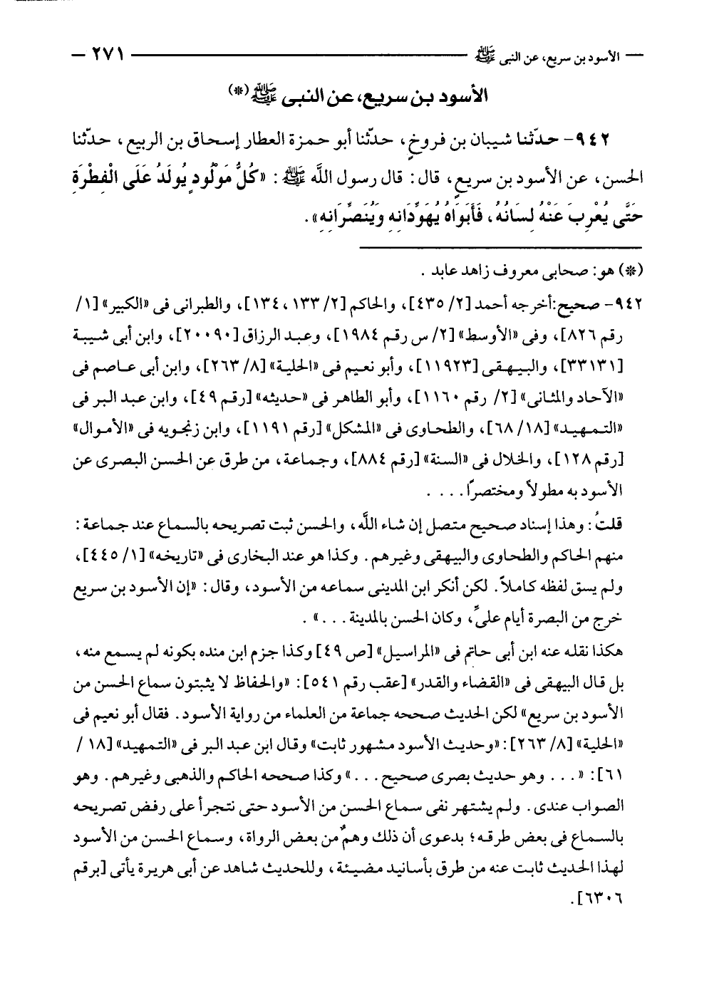 ٩٤٢ - صحيح: أخرجه أحمد [٢/ ٤٣٥]، والحاكم [٢/ ١٣٣، ١٣٤]، والطبرانى في "الكبير" [١/ رقم ٨٢٦]، وفى "الأوسط" [٢/ س رقم ١٩٨٤]، وعبد الرزاق [٢٠٠٩٠]، وابن أبى شيبة [٣٣١٣١]، والبيهقى [١١٩٣٢]، وأبو نعيم في "الحلية" [٨/ ٢٦٣]، وابن أبى عاصم في "الآحاد والمثانى" [٢/ رقم ١١٦٠]، وأبو الطاهر في "حديثه" [رقم ٤٩]، وابن عبد البر في "التمهيد" [٨/ ٦٨]، والكلحاوى في "المشكل" [رقم ١١٩١]، وابن زنجويه في "الأموال" [رقم ١٢٨]، والخلال في "السنة" [رقم ٨٨٤]، وجماعة، من طرق عن الحسن البصرى عن الأسود به مطولًا ومختصرًا ....