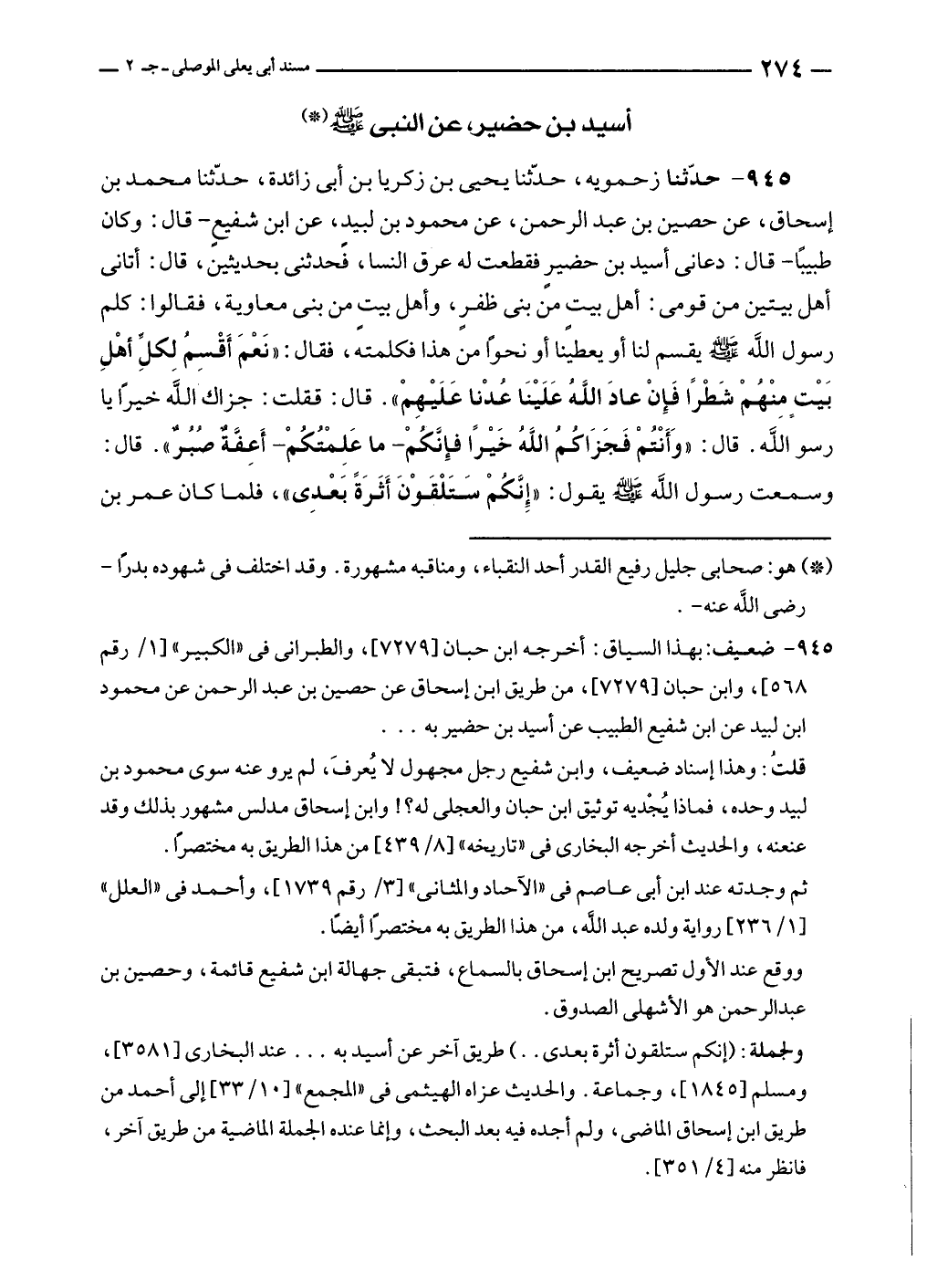 ٩٤٥ - حدّثنا زحمويه، حدّثنا يحيى بن زكريا بن أبى زائدة، حدّثنا محمد بن إسحاق، عن حصين بن عبد الرحمن، عن محمود بن لبيدٍ، عن ابن شفيعٍ - قال: وكان طبيبًا - قال: دعانى أسيد بن حضيرٍ فقطعت له عرق النسا، فحدثنى بحديثين، قال: أتانى أهل بيتين من قومى: أهل بيتٍ من بنى ظفرٍ، وأهل بيت من بنى معاوية، فقالوا: كلم رسول الله - صلى الله عليه وسلم - يقسم لنا أو يعطينا أو نحوًا من هذا فكلمته، فقال: "نَعْمَ أَقْسِمُ لِكلِّ أهْلِ بَيْتٍ مِنْهُمْ شَطْرًا فَإِنْ عادَ اللهُ عَلَيْنَا عُدْنا عَلَيْهِمْ". قال: ققلت: جزاك الله خيرًا يا رسول الله. قال: "وَأَنْتُمْ فَجَزَاكُمُ اللهُ خَيْرًا فإِنَّكُمْ - ما عَلِمْتُكُمْ - أَعِفَّةٌ صُبُرٌ". قال: وسمعت رسول الله - صلى الله عليه وسلم - يقول: "إِنَّكُمْ سَتَلْقَوْنَ أَثَرَةً بَعْدِى"، فلما كان عمر بن