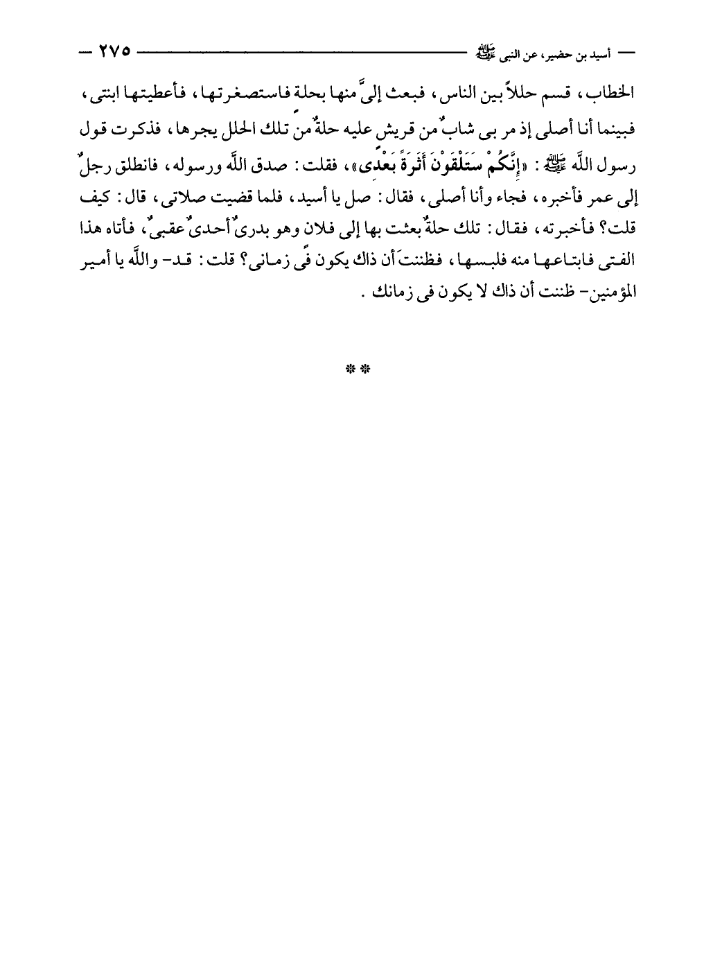 الخطاب، قسم حللًا بين الناس، فبعث إليَّ منها بحلةٍ فاستصغرتها، فأعطيتها ابنتى، فبينما أنا أصلى إذ مر بى شابٌ من قريشٍ عليه حلةٌ من تلك الحلل يجرها، فذكرت قول رسول الله - صلى الله عليه وسلم -: "إِنَّكمْ سَتَلْقَوْنَ أَثَرَةً بَعْدى"، فقلت: صدق الله ورسوله، فانطلق رجلٌ إلى عمر فأخبره، فجاء وأنا أصلى، فقال: صل يا أسيد، فلما قضيت صلاتى، قال: كيف قلت؟ فأخبرته، فقال: تلك حلةٌ بعثت بها إلى فلانٍ وهو بدرىٌ أحدىُ عقبىٌ، فأتاه هذا الفتى فابتاعها منه فلبسها، فظننتَ أن ذاك يكون في زمانى؟ قلت: قد - والله يا أمير المؤمنين - ظننت أن ذاك لا يكون في زمانك.