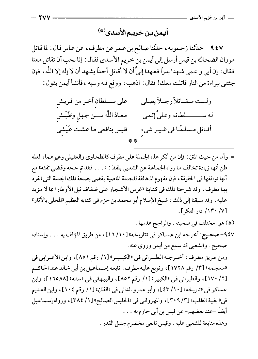 ٩٤٧ - حدّثنا زحمويه، حدّثنا صالح بن عمر عن مطرف، عن عامر قال: لما قاتل مروان الضحاك بن قيس أرسل إلى أيمن بن خريم الأسدى فقال: إنا نحب أن تقاتل معنا فقال: إن أبى وعمى شهدا بدرًا فعهدا إليَّ أن لا أقاتل أحدًا يشهد أن لا إله إلا الله، فإن جئتنى ببراءة من النار قاتلت معك! فقال: اذهب، ووقع فيه وسبه، فأنشأ أيمن يقول: