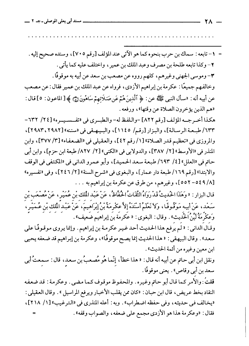 وخالفهم جميعًا: عكرمة بن إبراهيم الأزدى، فرواه عن عبد الملك بن عمير فقال: عن مصعب عن أبيه أنه: "سأل النبي - صلى الله عليه وسلم - عن: {الَّذِينَ هُمْ عَنْ صَلَاتِهِمْ سَاهُونَ (٥)} [الماعون: ٥] قال: "هم الذين يؤخرون الصلاة عن وقتها"، ورفعه.