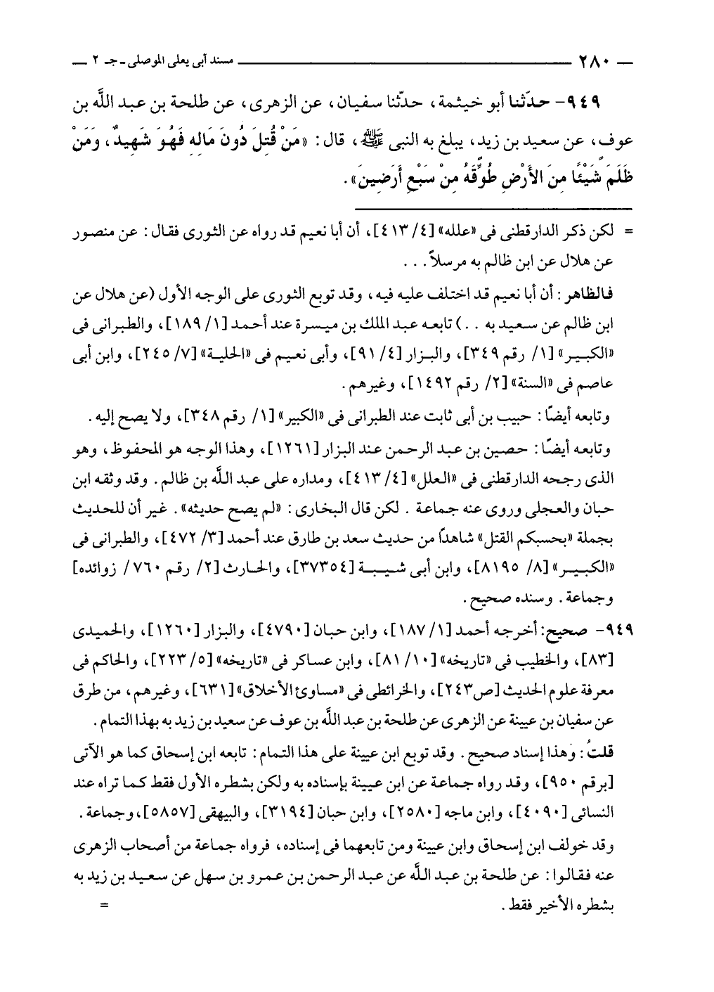 ٩٤٩ - حدّثنا أبو خيثمة، حدّثنا سفيان، عن الزهرى، عن طلحة بن عبد الله بن عوفٍ، عن سعيد بن زيدٍ، يبلغ به النبي - صلى الله عليه وسلم -، قال: "مَنْ قُتِلَ دُونَ مَالِهِ فَهُوَ شَهِيدٌ، وَمَنْ ظَلَمَ شَيْئًا مِنَ الأَرْضِ طُوِّقَهُ مِنْ سَبْعِ أَرَضِينَ".