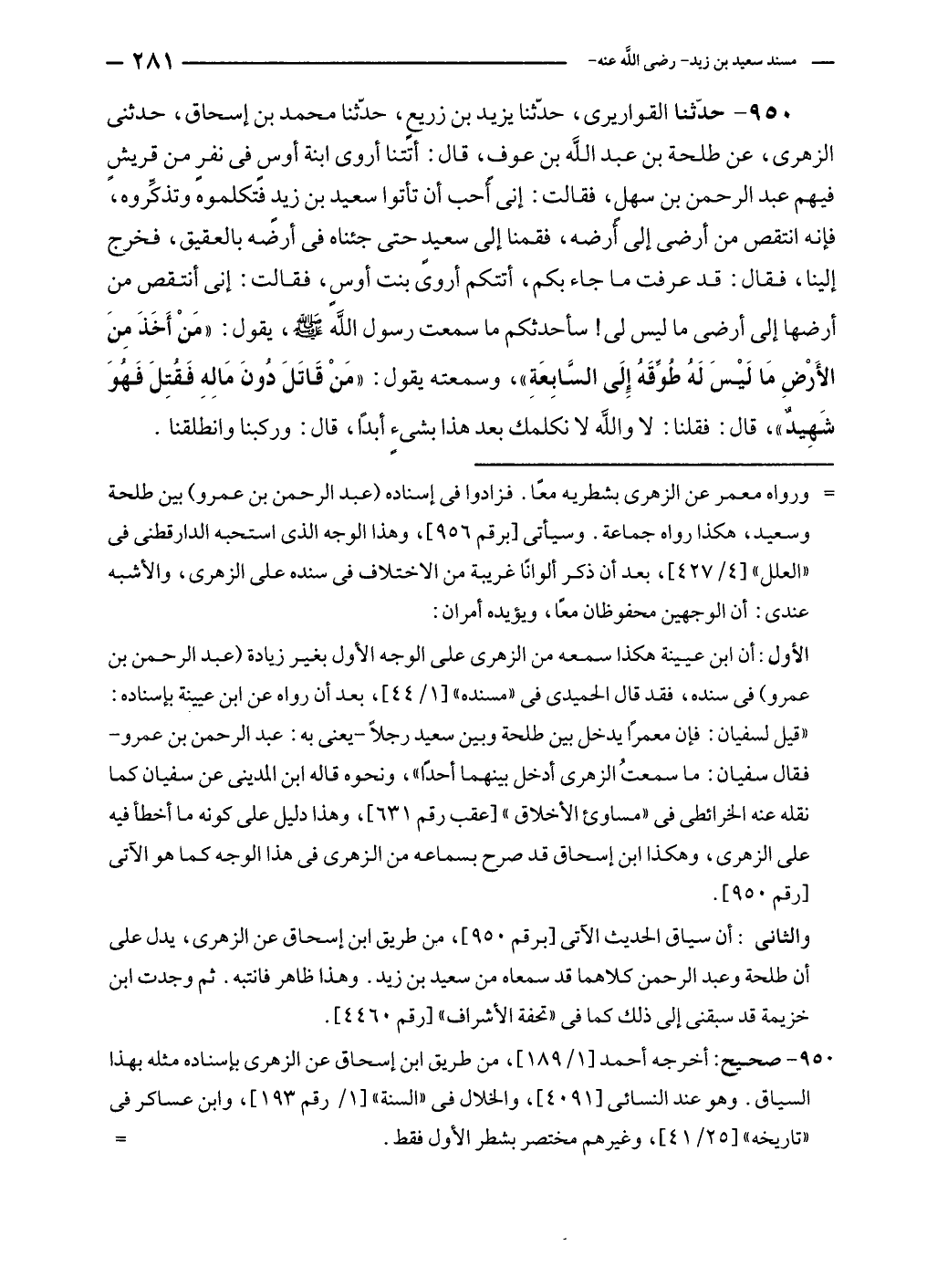 ٩٥٠ - حدّثنا القواريرى، حدّثنا يزيد بن زريعٍ، حدّثنا محمد بن إسحاق، حدثنى الزهرى، عن طلحة بن عبد الله بن عوفٍ، قال: أتتنا أروى ابنة أوسٍ في نفرٍ من قريشٍ فيهم عبد الرحمن بن سهلٍ، فقالت: إنى أحب أن تأتوا سعيد بن زيدٍ فتكلموه وتذكِّروه، فإنه انتقص من أرضى إلى أرضه، فقمنا إلى سعيدٍ حتى جئناه في أرضه بالعقيق، فخرج إلينا، فقال: قد عرفت ما جاء بكم، أتتكم أروى بنت أوسٍ، فقالت: إنى أنتقص من أرضها إلى أرضى ما ليس لى! سأحدثكم ما سمعت رسول الله - صلى الله عليه وسلم -، يقول: "مَنْ أَخَذَ مِنَ الأَرْضِ مَا لَيْسَ لَه طُوِّقَهُ إِلَى السَّابِعَةِ"، وسمعته يقول: "مَنْ قَاتَلَ دُونَ مَالِهِ فَقُتِلَ فَهُوَ شَهِيدٌ"، قال: فقلنا: لا والله لا نكلمك بعد هذا بشئٍ أبدًا، قال: وركبنا وانطلقنا.