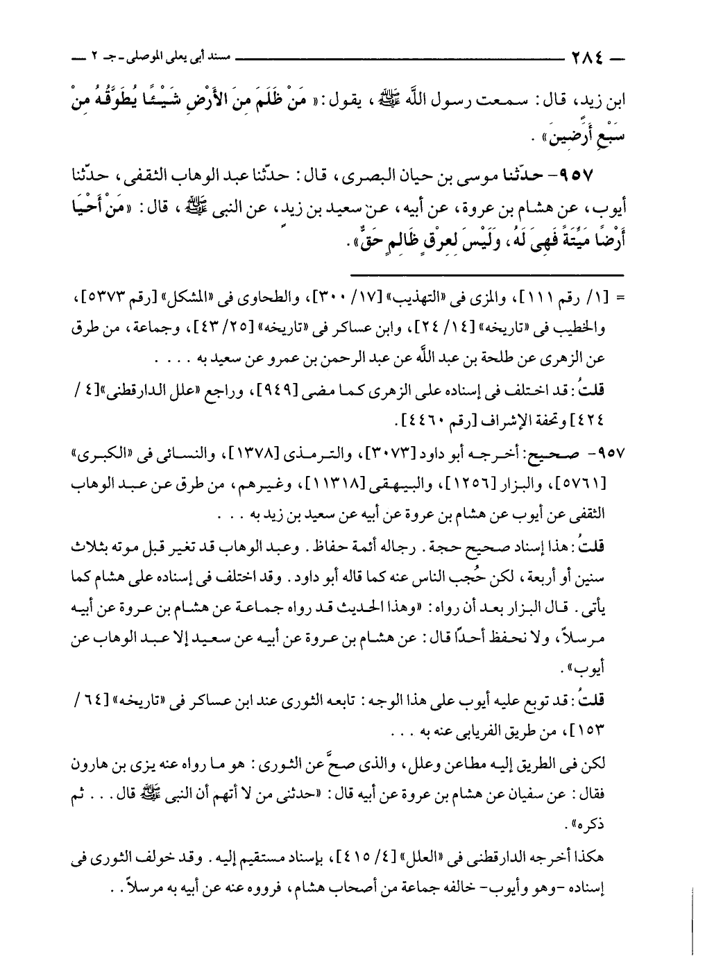 ٩٥٧ - حدّثنا موسى بن حيان البصرى، قال: حدّثنا عبد الوهاب الثقفى، حدّثنا أيوب، عن هشام بن عروة، عن أبيه، عن سعيد بن زيد، عن النبي - صلى الله عليه وسلم -، قال: "مَنْ أَحْيَا أَرْضًا مَيِّتَةً فَهِىَ لَهُ، وَلَيْسَ لِعِرْقٍ ظَالِمٍ حَقٌّ".