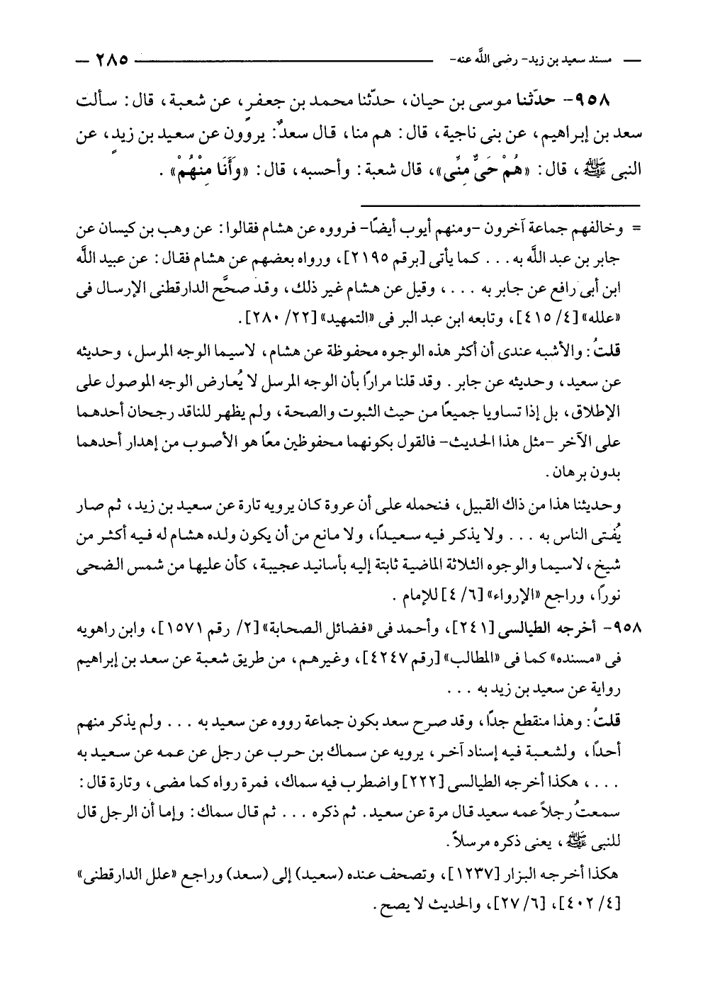 ٩٥٨ - أخرجه الطيالسى [٢٤١]، وأحمد في "فضائل الصحابة" [٢/ رقم ١٥٧١]، وابن راهويه في "مسنده" كما في "المطالب" [رقم ٤٢٤٧]، وغيرهم، من طريق شعبة عن سعد بن إبراهيم رواية عن سعيد بن زيد به ...