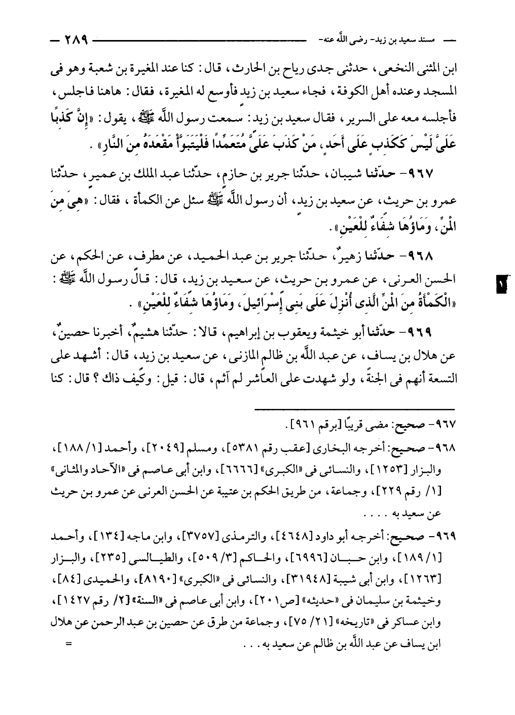 ٩٦٨ - حدّثنا زهيرٌ، حدّثنا جرير بن عبد الحميد، عن مطرفٍ، عن الحكم، عن الحسن العرنى، عن عمرو بن حريثٍ، عن سعيد بن زيدٍ، قال: قال رسول الله - صلى الله عليه وسلم -: "الْكَمْأَةُ مِنَ الْمنِّ الَّذِى أُنْزِلَ عَلَى بَنِى إِسْرَائِيلَ، وَمَاؤُهَا شِفَاءٌ لِلْعَيْنِ".