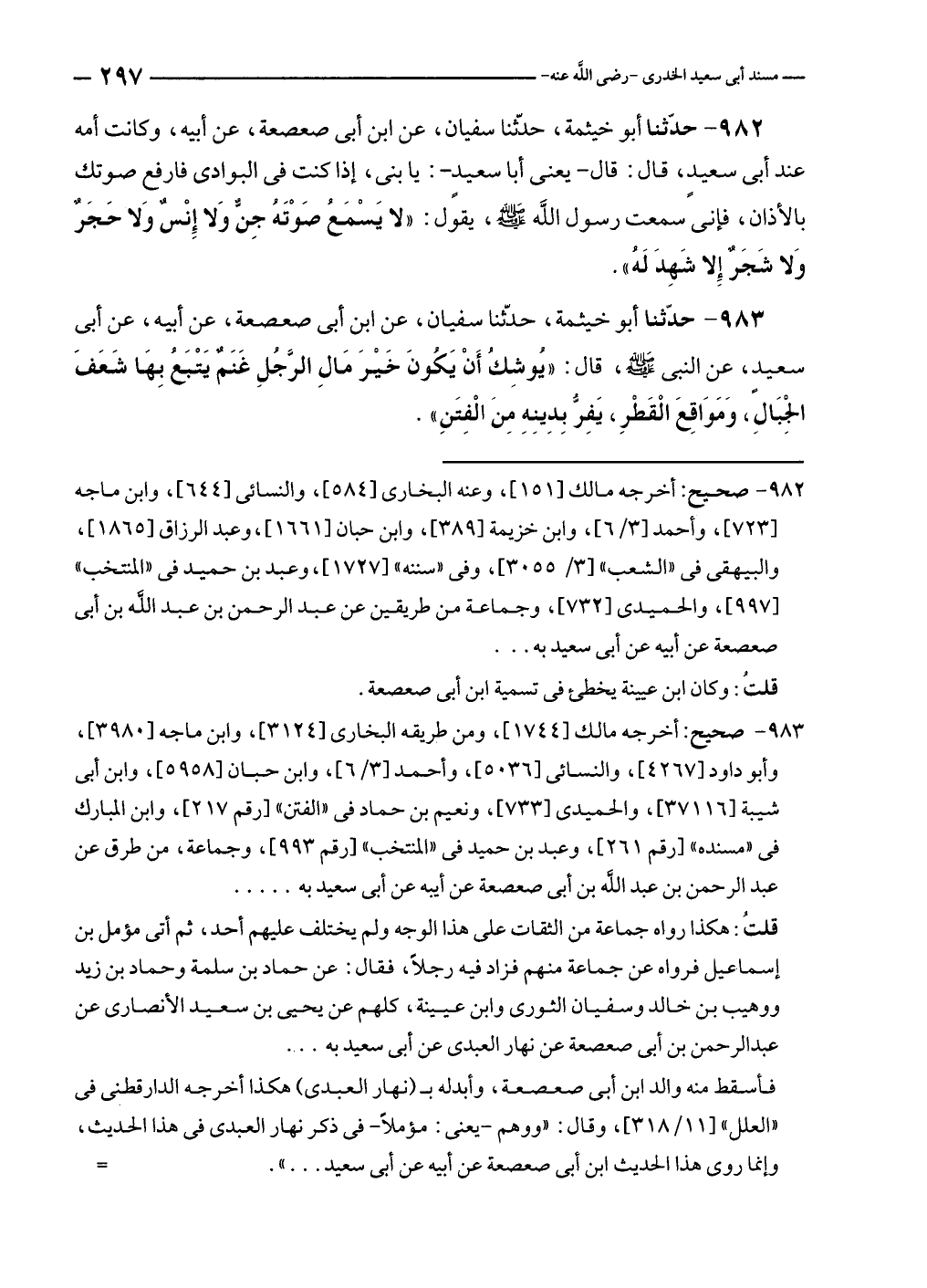 ٩٨٣ - صحيح: أخرجه مالك [١٧٤٤]، ومن طريقه البخارى [٣١٢٤]، وابن ماجه [٣٩٨٠]، وأبو داود [٤٢٦٧]، والنسائى [٥٠٣٦]، وأحمد [٣/ ٦]، وابن حبان [٥٩٥٨]، وابن أبى شيبة [٣٧١١٦]، والحميدى [٧٣٣]، ونعيم بن حماد في "الفتن" [رقم ٢١٧]، وابن المبارك في "مسنده" [رقم ٢٦١]، وعبد بن حميد في "المنتخب" [رقم ٩٩٣]، وجماعة، من طرق عن عبد الرحمن بن عبد الله بن أبى صعصعة عن أيبه عن أبى سعيد به .....