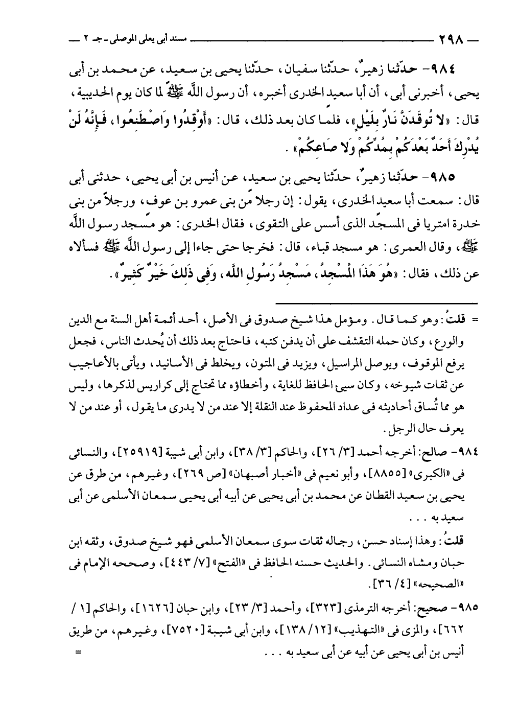 ٩٨٤ - صالح: أخرجه أحمد [٣/ ٢٦]، والحاكم [٣/ ٣٨]، وابن أبى شيبة [٢٥٩١٩]، والنسائى في "الكبرى" [٨٨٥٥]، وأبو نعيم في "أخبار أصبهان" [ص ٢٦٩]، وغيرهم، من طرق عن يحيى بن سعيد القطان عن محمد بن أبى يحيى عن أبيه أبى يحيى سمعان الأسلمى عن أبى سعيد به ...