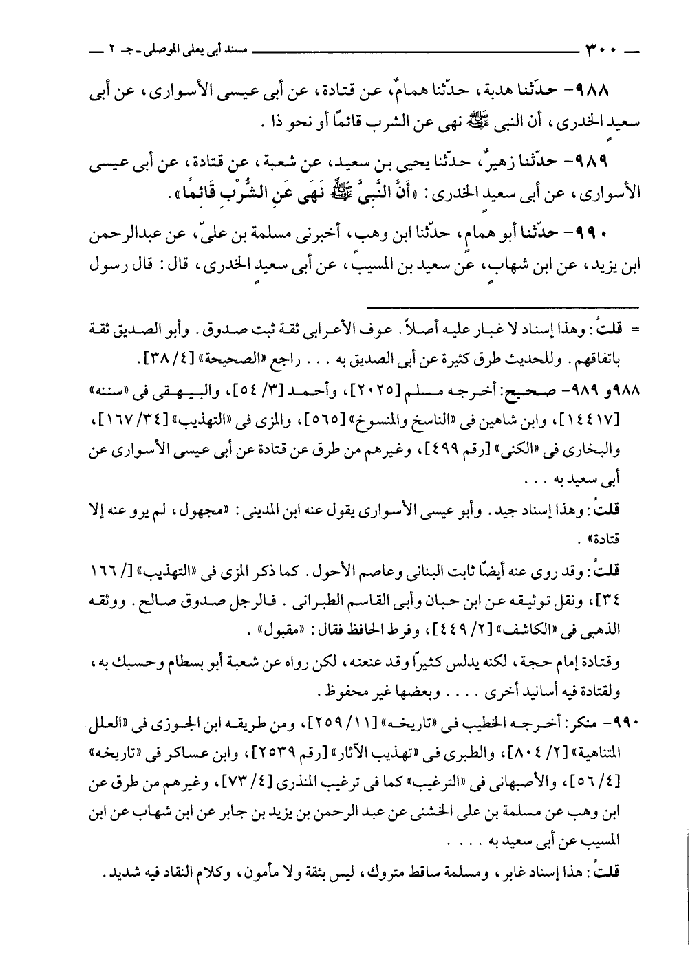 ٩٨٩ - حدّثنا زهيرٌ، حدثنا يحيى بن سعيد، عن شعبة، عن قتادة، عن أبى عيسى الأسوارى، عن أبى سعيدٍ الخدرى: "أَنَّ النَّبِيَّ - صلى الله عليه وسلم - نَهَى عَنِ الشُّرْبِ قَائِمًا".