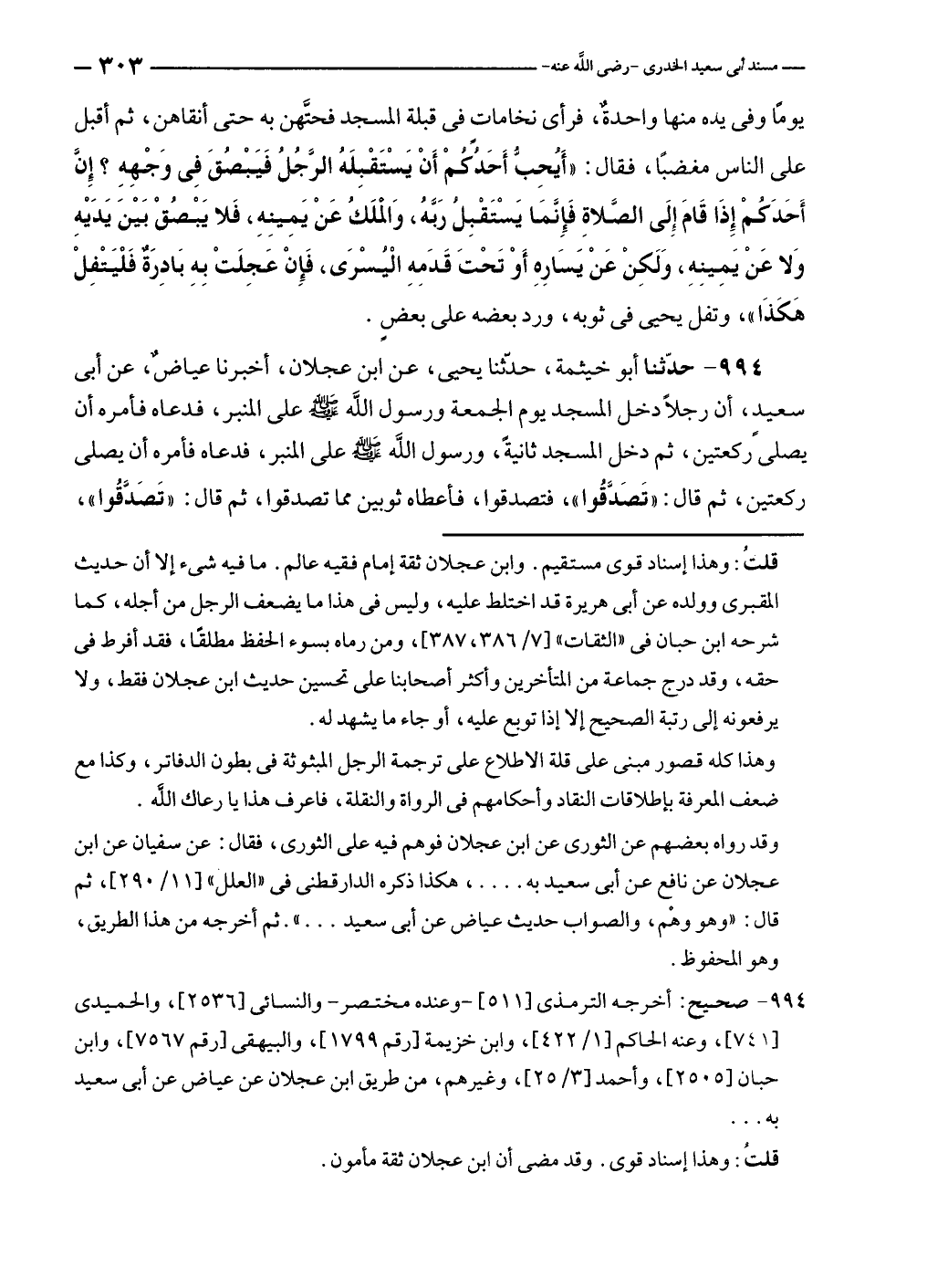 ٩٩٤ - صحيح: أخرجه الترمذى [٥١١]- وعنده مختصر - والنسائى [٢٥٣٦]، والحميدى [٧٤١]، وعنه الحاكم [١/ ٤٢٢]، وابن خزيمة [رقم ١٧٩٩]، والبيهقى [رقم ٧٥٦٧]، وابن حبان [٢٥٠٥]، وأحمد [٣/ ٢٥]، وغيرهم، من طريق ابن عجلان عن عياض عن أبى سعيد به ...