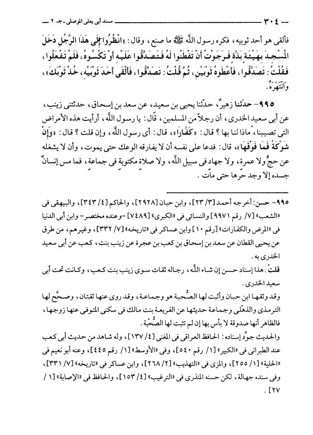 ٩٩٥ - حسن: أخرجه أحمد [٣/ ٢٣]، وابن حبان [٢٩٢٨]، والحاكم [٤/ ٣٤٣]، والبيهقى في "الشعب" [٧/ رقم ٩٩٧١] والنسائى في "الكبرى" [٧٤٨٩]- وعنده مختصر - وابن أبى الدنيا في "المرض والكفارات" [رقم ١٠] وابن عساكر في "تاريخه" [٧/ ٣٣٢]، وغيرهم، من طرق عن يحيى القطان عن سعد بن إسحاق بن كعب بن عجرة عن زينب بنت، كعب عن أبى سعيد الخدرى به.