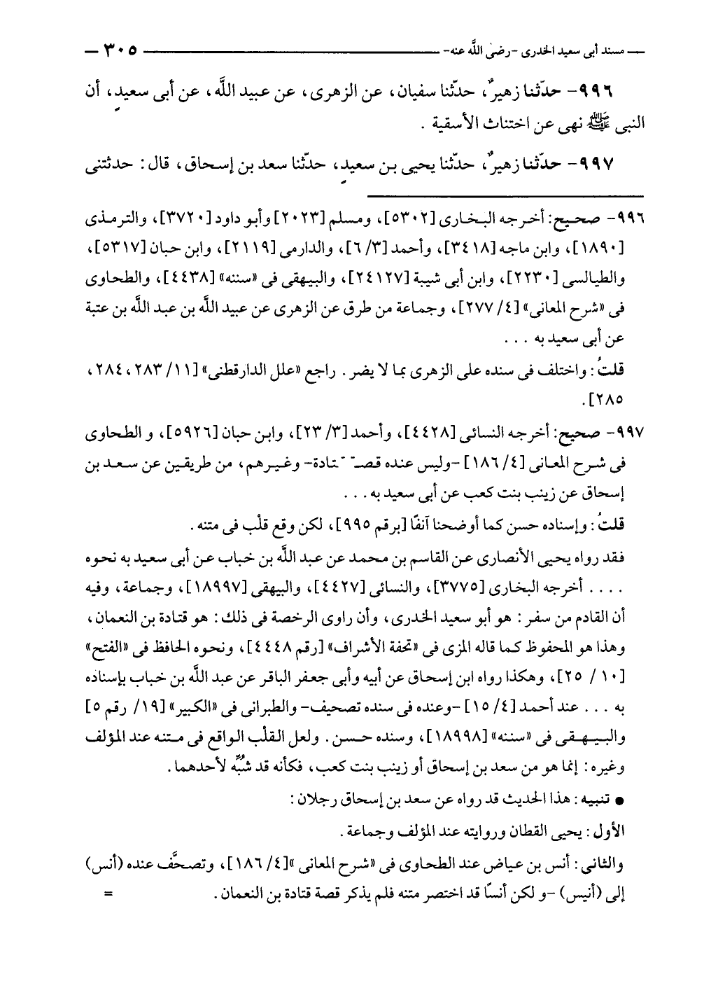 ٩٩٧ - صحيح: أخرجه النسائي [٤٤٢٨]، وأحمد [٣/ ٢٣]، وابن حبان [٥٩٢٦]، والطحاوى في شرح المعانى [٤/ ١٨٦]- وليس عنده قصة قتادة - وغيرهم، من طريقين عن سعد بن إسحاق عن زينب بنت كعب عن أبى سعيد به ...