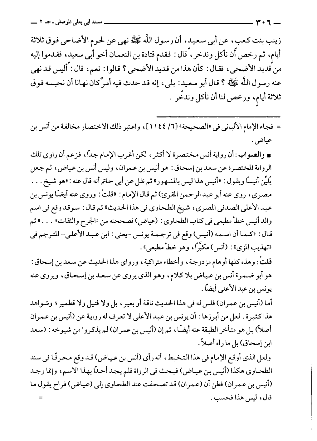• والصواب: أن رواية أنس مختصرة لا أكثر، لكن أغرب الإمام جدًّا، فزعم أن راوى تلك الرواية المختصرة عن سعد بن إسحاق: هو أنيس بن عمران، وليس أنس بن عياض، ثم جعل يُليِّن أنيسًا ويقول: "أنيس هذا ليس بالمشهور" ثم نقل عن أبى حاتم أنه قال عنه: "هو شيخ ... مصرى، روى عنه أبو عبد الرحمن المقرئ) ثم قال الإمام: "قلتُ: وروى عنه أيضًا يونس بن عبد الأعلى الصدفى المصرى، شيخ الطحاوى في هذا الحديث" ثم قال: سوقد وقع في اسم والد أنيس خطأ مطبعى في كتاب الطحاوى: (عياض) فصححته من "الجرح والثقات" ... " ثم قال: "كما أن اسمه (أنيس) وقع في ترجمة يونس - يعنى: ابن عبد الأعلى - المترجم في "تهذيب المزى": (أنس) مكبَّرًا، وهو خطأ مطبعى".