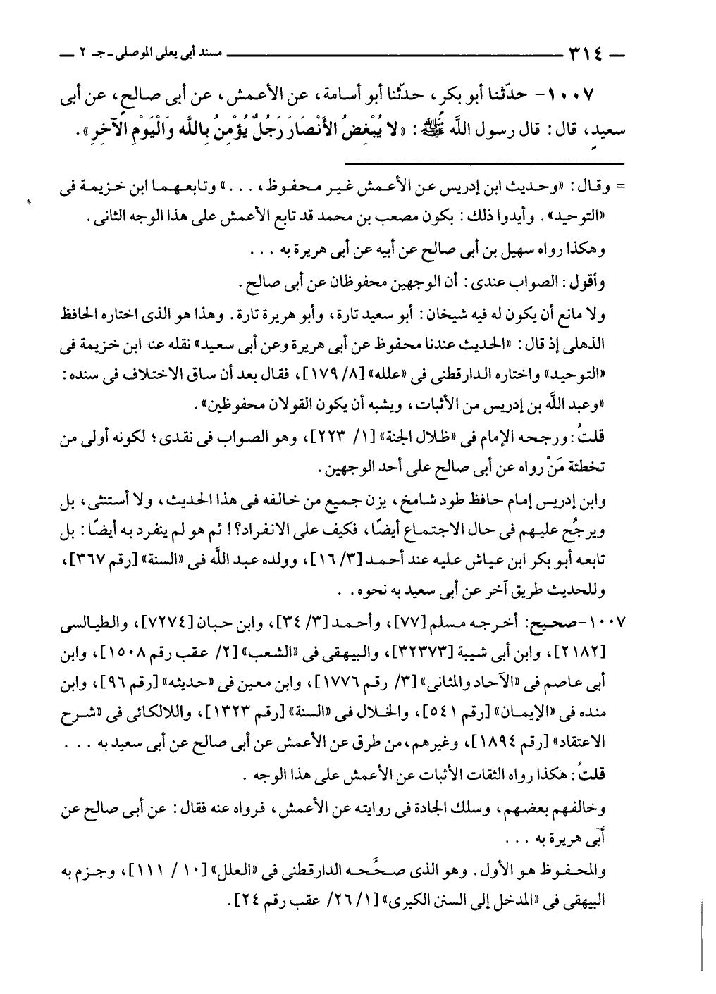 ١٠٠٧ - صحيح: أخرجه مسلم [٧٧]، وأحمد [٣/ ٣٤]، وابن حبان [٧٢٧٤]، والطيالسى [٢١٨٢]، وابن أبى شيبة [٣٢٣٧٣]، والبيهقى في "الشعب" [٢/ عقب رقم ١٥٠٨]، وابن أبى عاصم في "الآحاد والمثانى" [٣/ رقم ١٧٧٦]، وابن معين في "حديثه" [رقم ٩٦]، وابن منده في "الإيمان" [رقم ٥٤١]، والخلال في "السنة" [رقم ١٣٢٣]، واللالكائى في "شرح الاعتقاد" [رقم ١٨٩٤]، وغيرهم، من طرق عن الأعمش عن أبى صالح عن أبى سعيد به ...