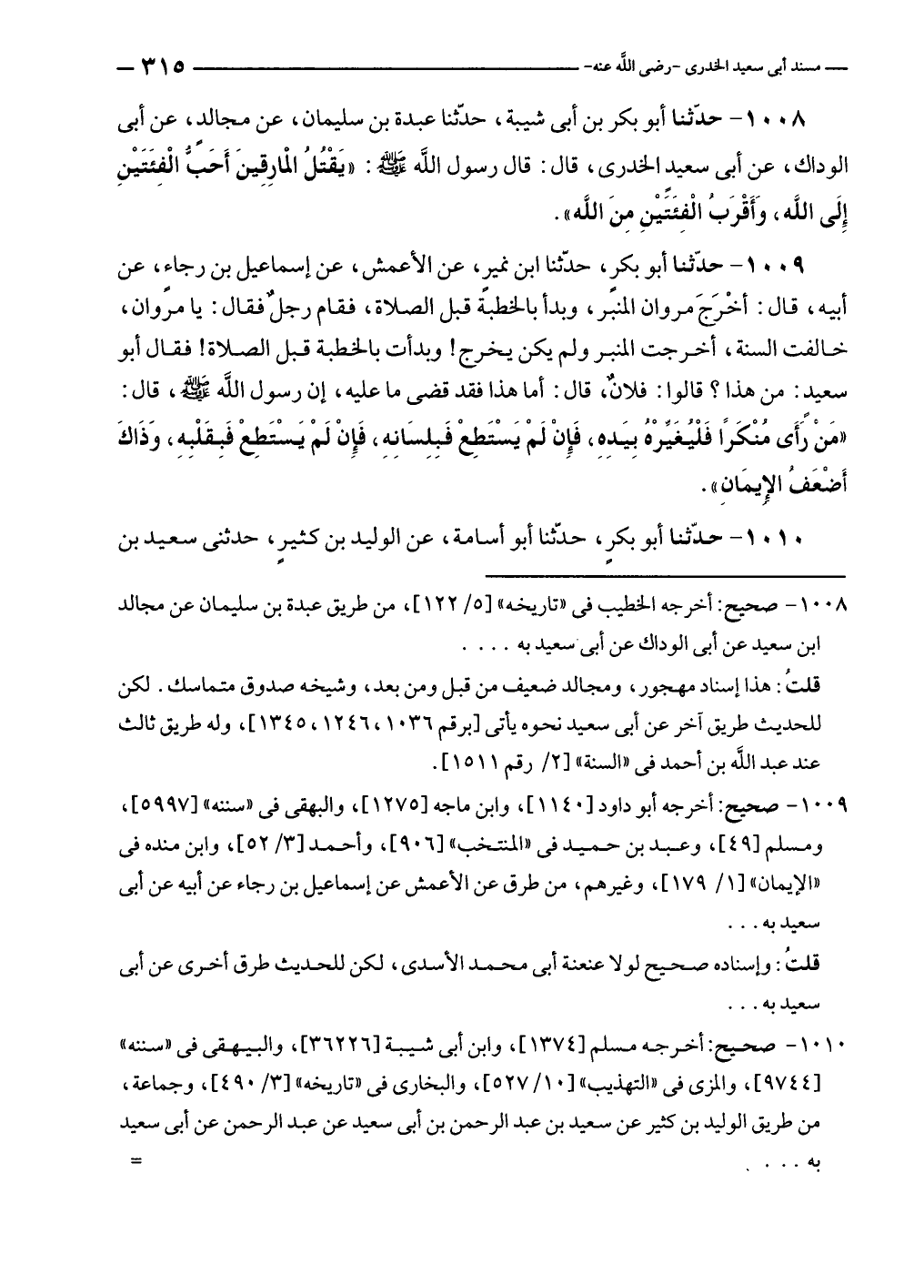 ١٠٠٨ - حدثنا أبو بكر بن أبى شيبة، حدثنا عبدة بن سليمان، عن مجالد، عن أبى الوداك، عن أبى سعيد الخدرى، قال: قال رسول الله - صلى الله عليه وسلم -: "يَقْتُلُ المْارِقِينَ أَحَبُّ الْفِئَتَيْنِ إِلَى الله، وَأَقْرَب الْفِئَتَيْنِ مِنَ الله".