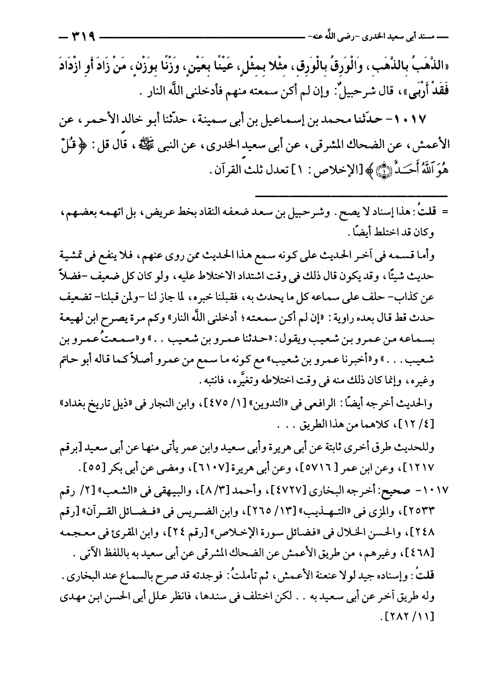 ١٠١٧ - حدّثنا محمد بن إسماعيل بن أبى سمينة، حدّثنا أبو خالد الأحمر، عن الأعمش، عن الضحاك المشرقى، عن أبى سعيد الخدرى، عن النبي - صلى الله عليه وسلم -، قال قل: {قُلْ هُوَ اللَّهُ أَحَدٌ (١)} [الإخلاص: ١] تعدل ثلث القرآن.