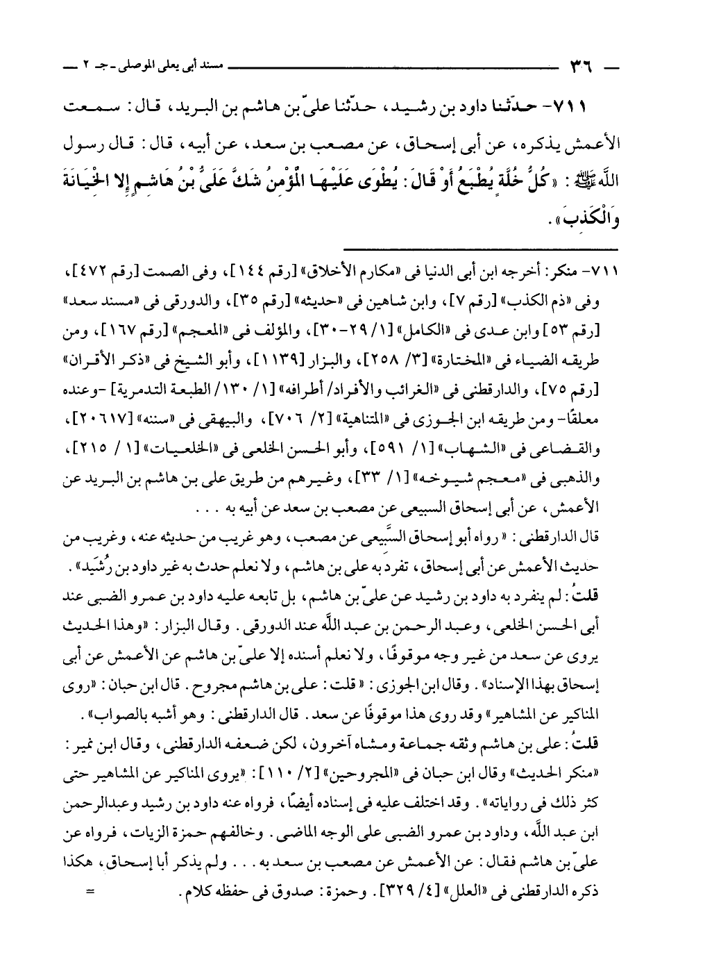 ٧١١ - حدّثنا داود بن رشيد، حدّثنا على بن هاشم بن البريد، قال: سمعت الأعمش يذكره، عن أبى إسحاق، عن مصعب بن سعد، عن أبيه، قال: قال رسول الله - صلى الله عليه وسلم -: "كُلُّ خُلَّةٍ يُطْبَعُ أَوْ قَالَ: يُطْوَى عَلَيْهَا المُؤْمِنُ شَكَّ عَلَيُّ بْنُ هَاشِمٍ إِلا الْخيَانَةَ وَالكَذِبَ".