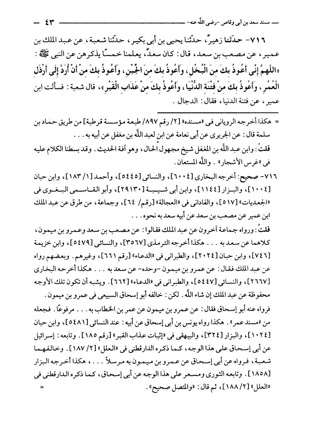 ٧١٦ - حدّثنا زهيرٌ، حدّثنا يحيى بن أبى بكير، حدّثنا شعبة، عن عبد الملك بن عمير، عن مصعب بن سعد، قال: كان سعدٌ، يعلمنا خمسًا يذكرهن عن النبي - صلى الله عليه وسلم -: "اللَّهمَّ إِنِّي أَعُوذُ بِكَ مِنَ الْبُخْلِ، وَأَعُوذُ بكَ مِنَ الْجبْنِ، وَأَعُوذ بِكَ مِنْ أَنْ أُرَدَّ إِلَى أَرْذَلِ الْعُمُرِ، وَأَعُوذُ بِكَ مِنْ فِتْنَةِ الدُّنْيَا، وَأَعُوذُ بِكَ مِنْ عَذَابِ الْقَبْرِ"، قال شعبة: فسألت ابن عمير، عن فتنة الدنيا، فقال: الدجال.