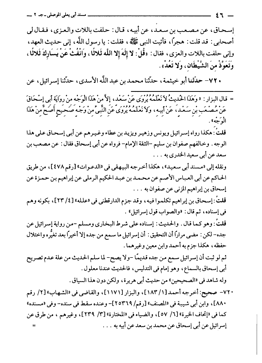 قلتُ، هكذا رواه إسرائيل ويونس وزهير ويزيد بن عطاء وغيرهم عن أبي إسحاق على هذا الوجه. وخالفهم صفوان بن سليم - الثقة الإمام - فرواه عن أبي إسحاق فقال: عن مصعب بن سعد عن أبي سعيد الخدري به ...