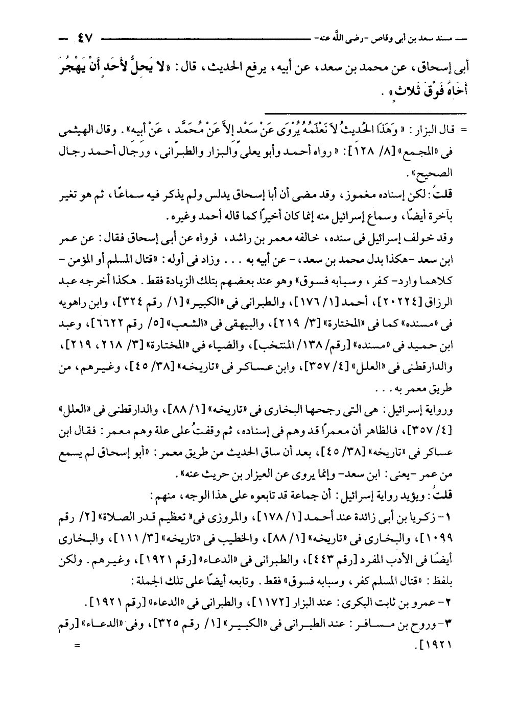 وقد خولف إسرائيل في سنده، خالفه معمر بن راشد، فرواه عن أبي إسحاق فقال: عن عمر بن سعد - هكذا بدل محمد بن سعد، - عن أبيه به ... وزاد في أوله: "قتال المسلم أو المؤمن - كلاهما وارد - كفر، وسبابه فسوق" وهو عند بعضهم بتلك الزيادة فقط. هكذا أخرجه عبد الرزاق [٢٠٢٢٤]، أحمد [١/ ١٧٦]، والطبراني في "الكبير" [١/ رقم ٣٢٤]، وابن راهويه في "مسنده" كما في "المختارة" [٣/ ٢١٩]، والبيهقي في "الشعب" [٥/ رقم ٦٦٢٢]، وعبد ابن حميد في "مسنده" [رقم / ١٣٨/ المنتخب]، والضياء في "المختارة" [٣/ ٢١٨، ٢١٩]، والدارقطني في "العلل" [٤/ ٣٥٧]، وابن عساكر في "تاريخه" [٣٨/ ٤٥]، وغيرهم، من طريق معمر به ...