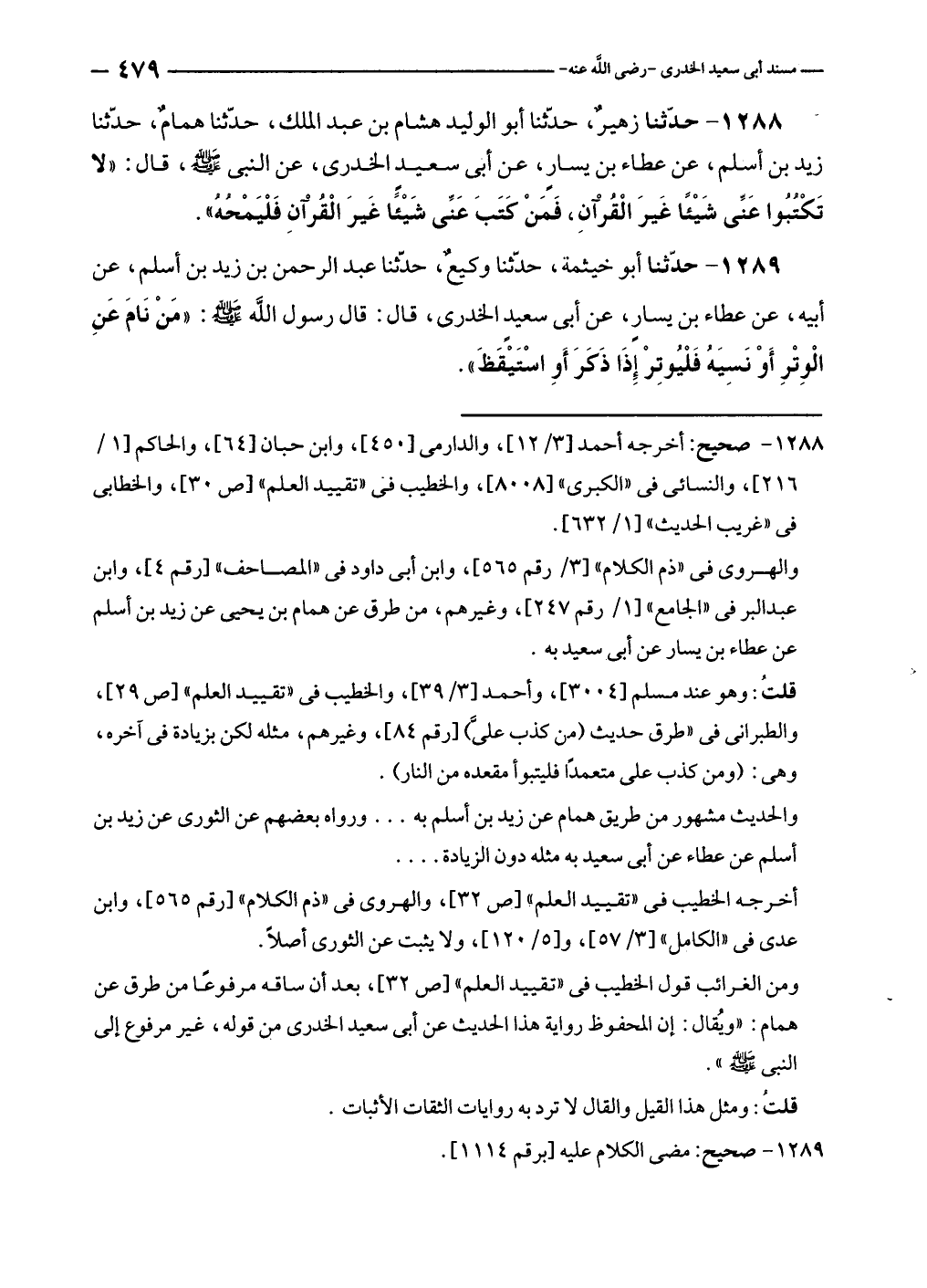 ١٢٨٨ - حدّثنا زهيرٌ، حدّثنا أبو الوليد هشام بن عبد الملك، حدّثنا همامٌ، حدّثنا زيد بن أسلم، عن عطاء بن يسارٍ، عن أبى سعيد الخدرى، عن النبي - صلى الله عليه وسلم -، قال: "لا تَكْتُبُوا عَنِّى شَيْئًا غَيرَ الْقُرْآنِ، فَمَنْ كتَبَ عَنى شَيْئًا غَيرَ الْقُرْآنِ فَلْيَمْحُهُ".