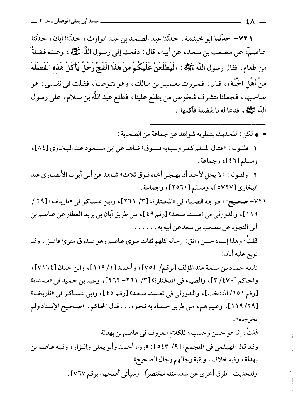 ٧٢١ - حدّثنا أبو خيثمة، حدّثنا عبد الصمد بن عبد الوارث، حدّثنا أبان، حدّثنا عاصم، عن مصعب بن سعد، عن أبيه، قال: دفعت إلى رسول الله - صلى الله عليه وسلم -، وعنده فضلة من طعام، فقال رسول الله - صلى الله عليه وسلم -: "لَيَطْلَعَنَّ عَلَيْكُمْ مِنْ هَذَا الْفَجِّ رَجُلٌ يَأْكُلُ هَذِهِ الْفَضْلَةَ من أهل الجنَّة"، قال: فمررت بعمير بن مالك، وهو يتوضأ، فقلت في نفسى: هو صاحبها، فجعلنا نتشرف شخوص من يطلع علينا، فطلع عبد الله بن سلام، على رسول الله - صلى الله عليه وسلم -، فدعا له بالفضلة فأكلها.