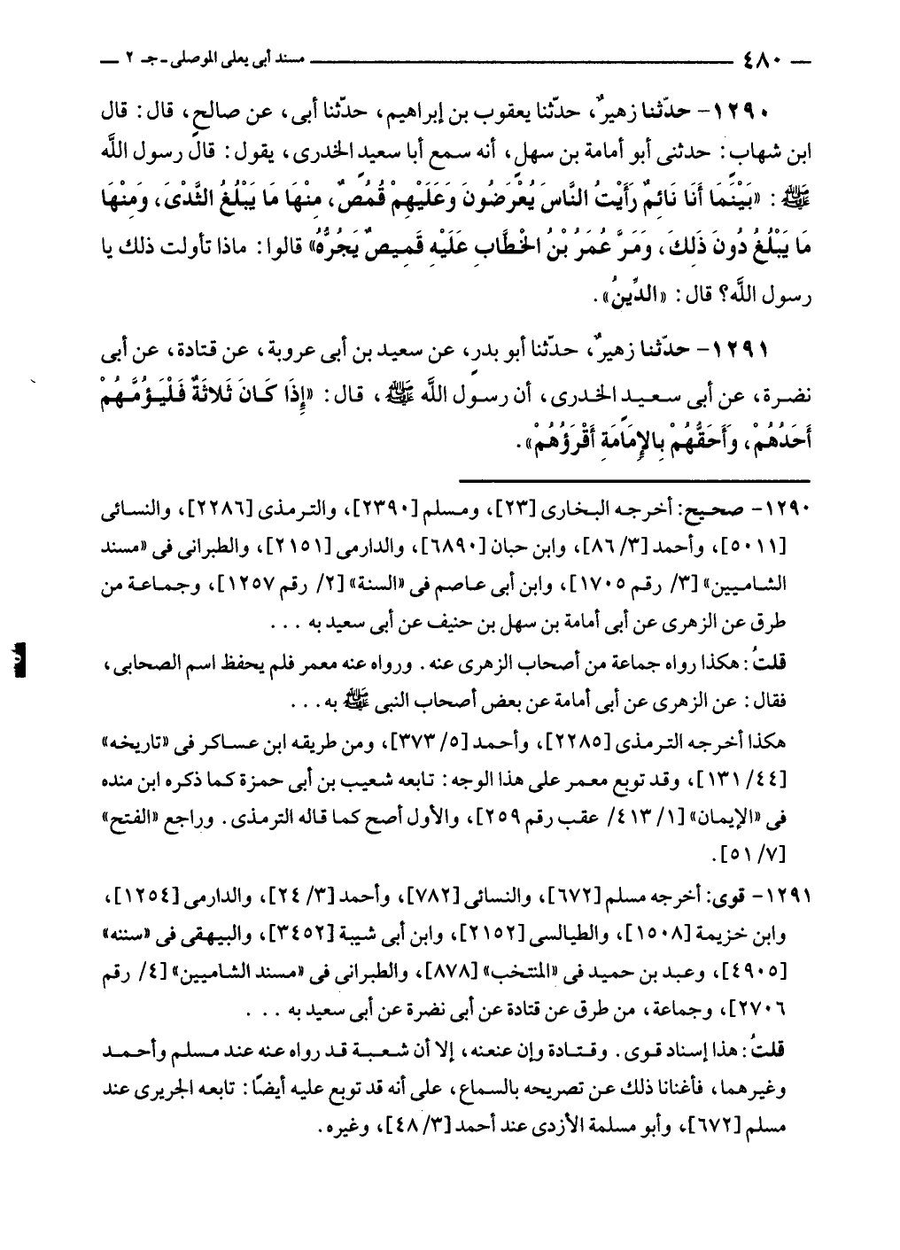 ١٢٩٠ - حدّثنا زهير، حدّثنا يعقوب بن إبراهيم، حدّثنا أبى، عن صالحٍ، قال: قال ابن شهاب: حدثنى أبو أمامة بن سهلٍ، أنه سمع أبا سعيدٍ الخدرى، يقول: قال رسول الله - صلى الله عليه وسلم -: "بَيْنَمَا أَنَا نَائِمٌ رَأَيْتُ النَّاسَ يُعْرَضُونَ وَعَلَيْهِمْ قُمُصٌ، منْهَا مَا يَبْلُغُ الثَّدْىَ، وَمِنْهَا مَا يَبْلُغُ دُونَ ذَلِكَ، وَمَرَّ عُمَرُ بْنُ الخْطَّابِ عَلَيْهِ قَمِيصٌ يَجُرُّهُ" قالوا: ماذا تأولت ذلك يا رسول الله؟ قال: "الدِّينُ".