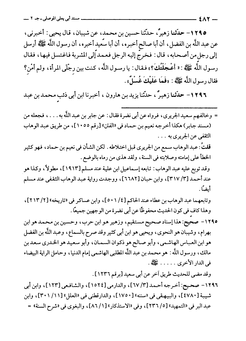 ١٢٩٥ - صحيح: هذا إسناد صحيح مستقيم، وزهير هو ابن حرب، وحسين بن محمد هو ابن بهرام، وشيبان هو النحوى، ويحيى هو ابن أبى كثير وقد صرح بالسماع، وعبد الله بن الفضل هو ابن العباس الهاشمى، وأبو صالح هو ذكوان السمان، وأبو سعيد هو الخدرى سعد بن مالك، ورسول الله: هو محمد بن عبد الله المطلبى الهاشمى إمام الدنيا، وحامك الراية البيضاء في الدار الأخرى ..... - صلى الله عليه وسلم -.