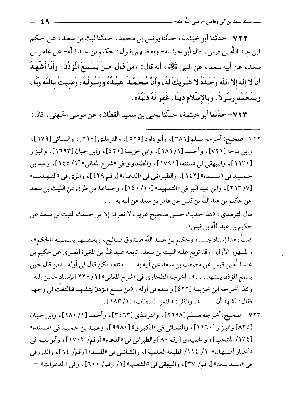 ٧٢٢ - حدّثنا أبو خيثمة، حدّثنا يونس بن محمد، حدّثنا ليث بن سعد، عن الحكم بن عبد الله بن قيس، قال أبو خيثمة - وبعضهم يقول: حكيم بن عبد الله - عن عامر بن سعد، عن أبيه سعد، عن النبي - صلى الله عليه وسلم -، أنه قال: "مَنْ قَالَ حِينَ يَسْمَعُ الْمُؤَذِّنَ: وأَنَا أَشهَدُ أن لا إِلَهَ إِلا الله وَحْدَهُ لا شَرِيكَ لَهُ، وَأَنَّ مُحَمَّدًا عَبْدُهُ وَرَسولُهُ، رَضِيتُ بِاللَّه رَبًّا، وَبِمُحَمَّدٍ رَسُولًا، وَبِالإسلامِ دِينًا، غُفِرَ لَهُ ذَنْبُهُ".