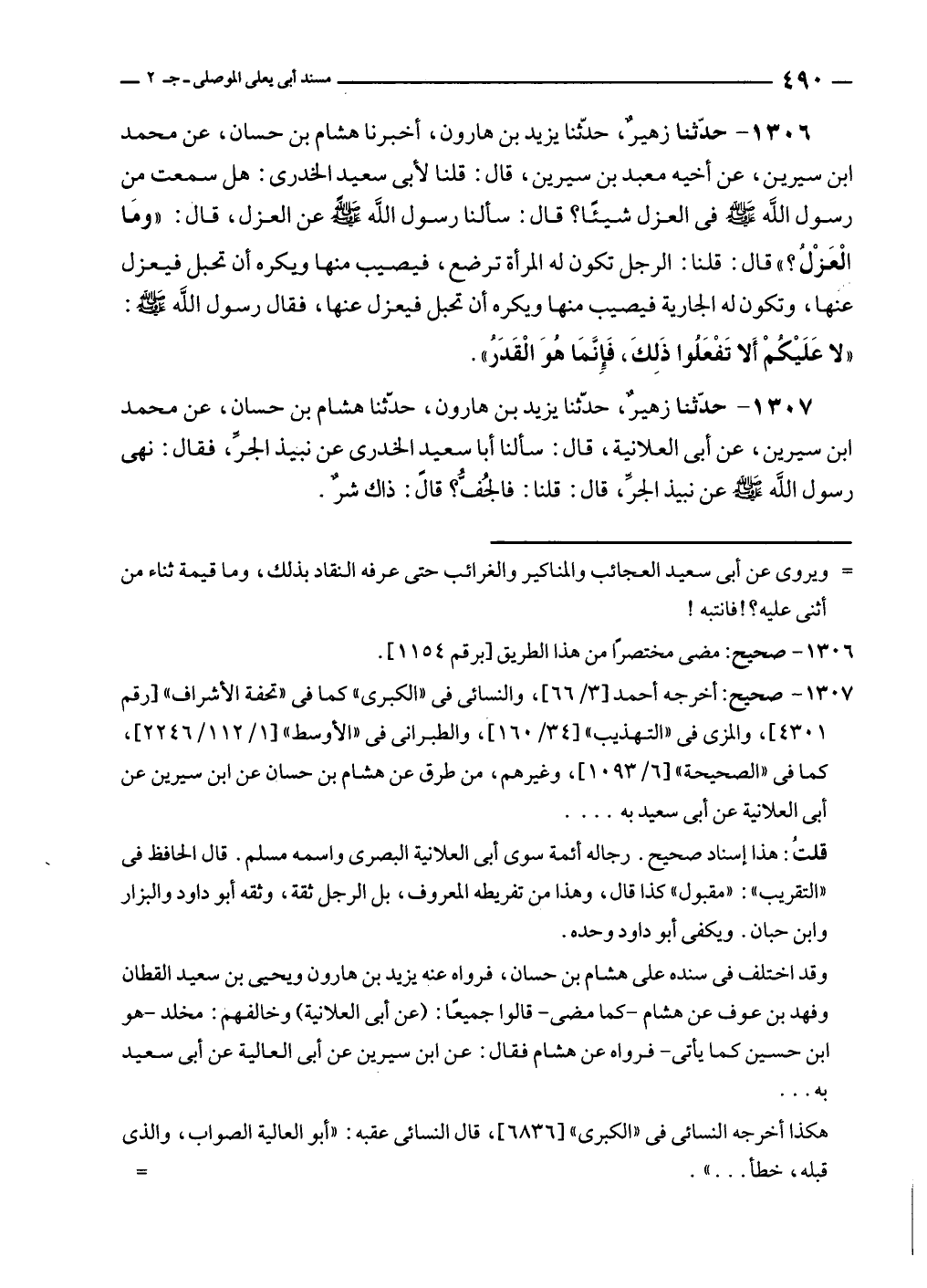 ١٣٠٦ - حدّثنا زهيرٌ، حدّثنا يزيد بن هارون، أخبرنا هشام بن حسان، عن محمد بن سيرين، عن أخيه معبد بن سيرين، قال: قلنا لأبى سعيد الخدرى: هل سمعت من رسول الله - صلى الله عليه وسلم - في العزل شيئًا؟ قال: سألنا رسول الله - صلى الله عليه وسلم - عن العزل، قال: "ومَا الْعَزْلُ؟ " قال: قلنا: الرجل تكون له المرأة ترضع، فيصيب منها ويكره أن تحبل فيعزل عنها، وتكون له الجارية فيصيب منها ويكره أن تحبل فيعزل عنها، فقال رسول الله - صلى الله عليه وسلم -: "لا عَلَيْكمْ أَلا تَفْعَلُوا ذَلِكَ، فَإِنمَا هُوَ الْقَدَر".