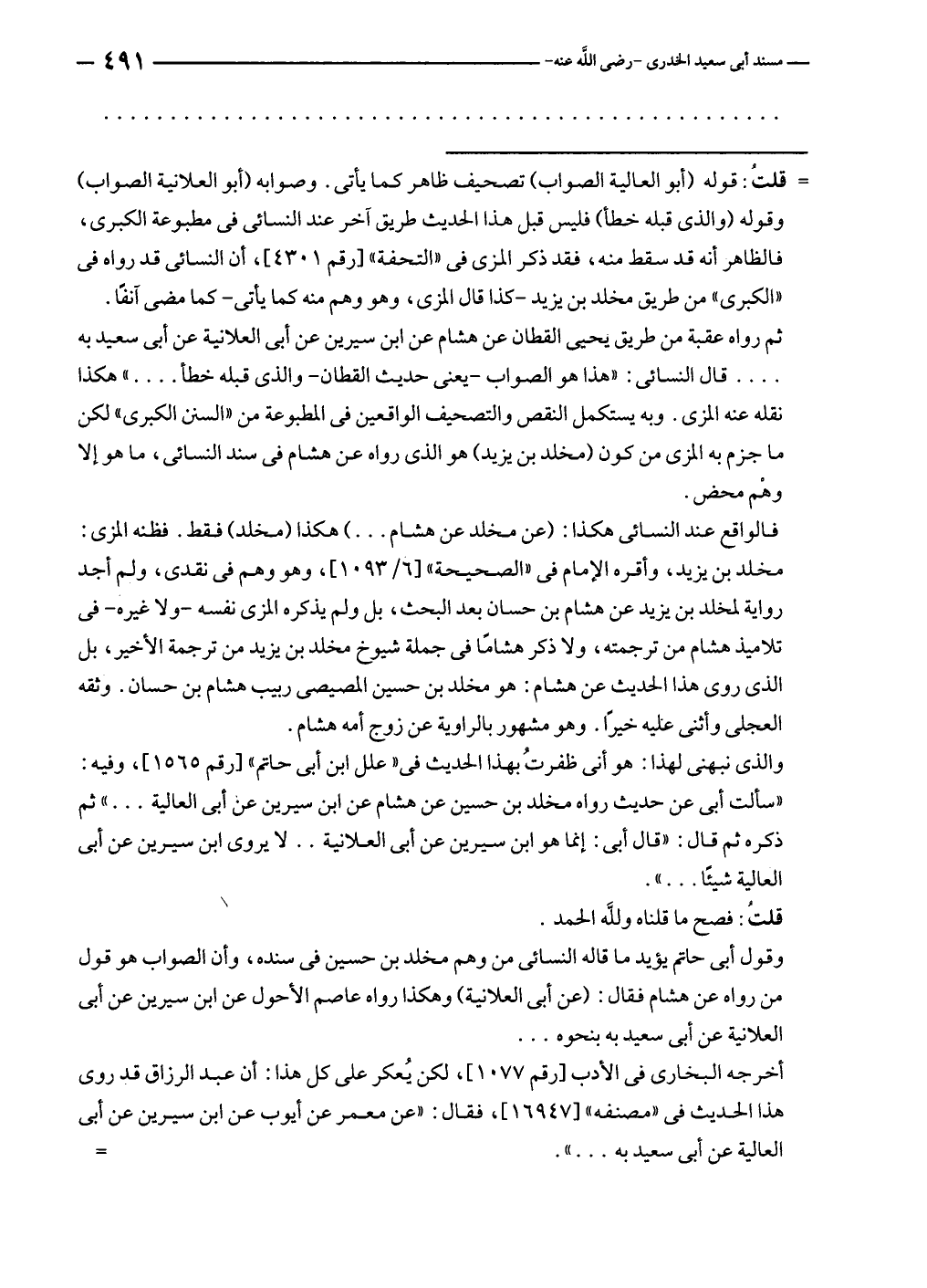 ثم رواه عقبة من طريق يحيى القطان عن هشام عن ابن سيرين عن أبى العلانية عن أبى سعيد به .... قال النسائي: "هذا هو الصواب - يعنى حديث القطان - والذى قبله خطأ .... " هكذا نقله عنه المزى. وبه يستكمل النقص والتصحيف الواقعين في المطبوعة من "السنن الكبرى" لكن ما جزم به المزى من كون (مخلد بن يزيد) هو الذي رواه عن هشام في سند النسائي، ما هو إلا وهْم محض.