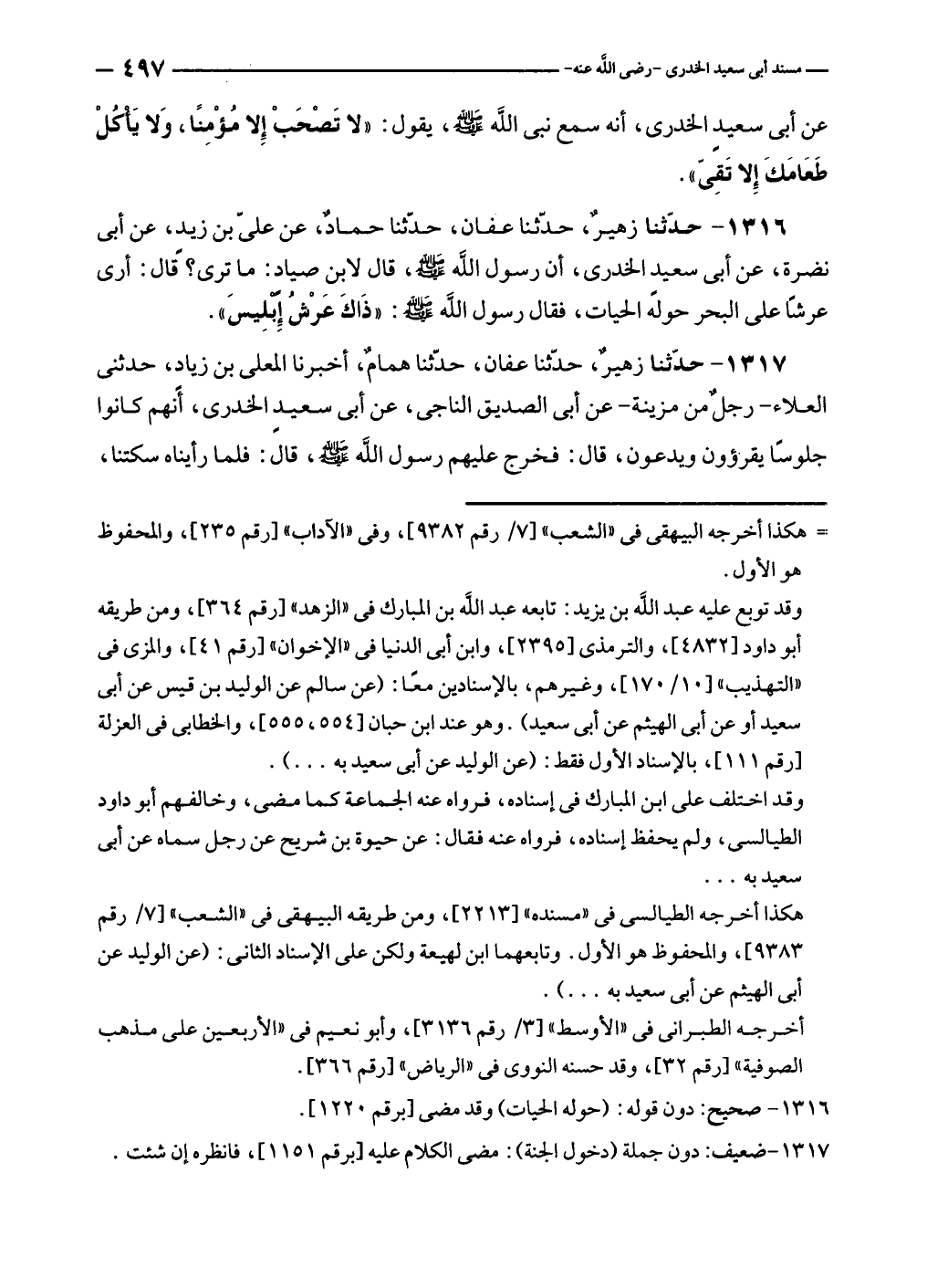 ١٣١٦ - حدّثنا زهيرٌ، حدّثنا عفان، حدّثنا حمادٌ، عن علي بن زيدٍ، عن أبي نضرة، عن أبي سعيدٍ الخدرى، أن رسول الله - صلى الله عليه وسلم -، قال لابن صياد: ما ترى؟ قَال: أرى عرشًا على البحر حوله الحيات، فقال رسول الله - صلى الله عليه وسلم -: "ذَاكَ عَرْشُ إِبلِيسَ".