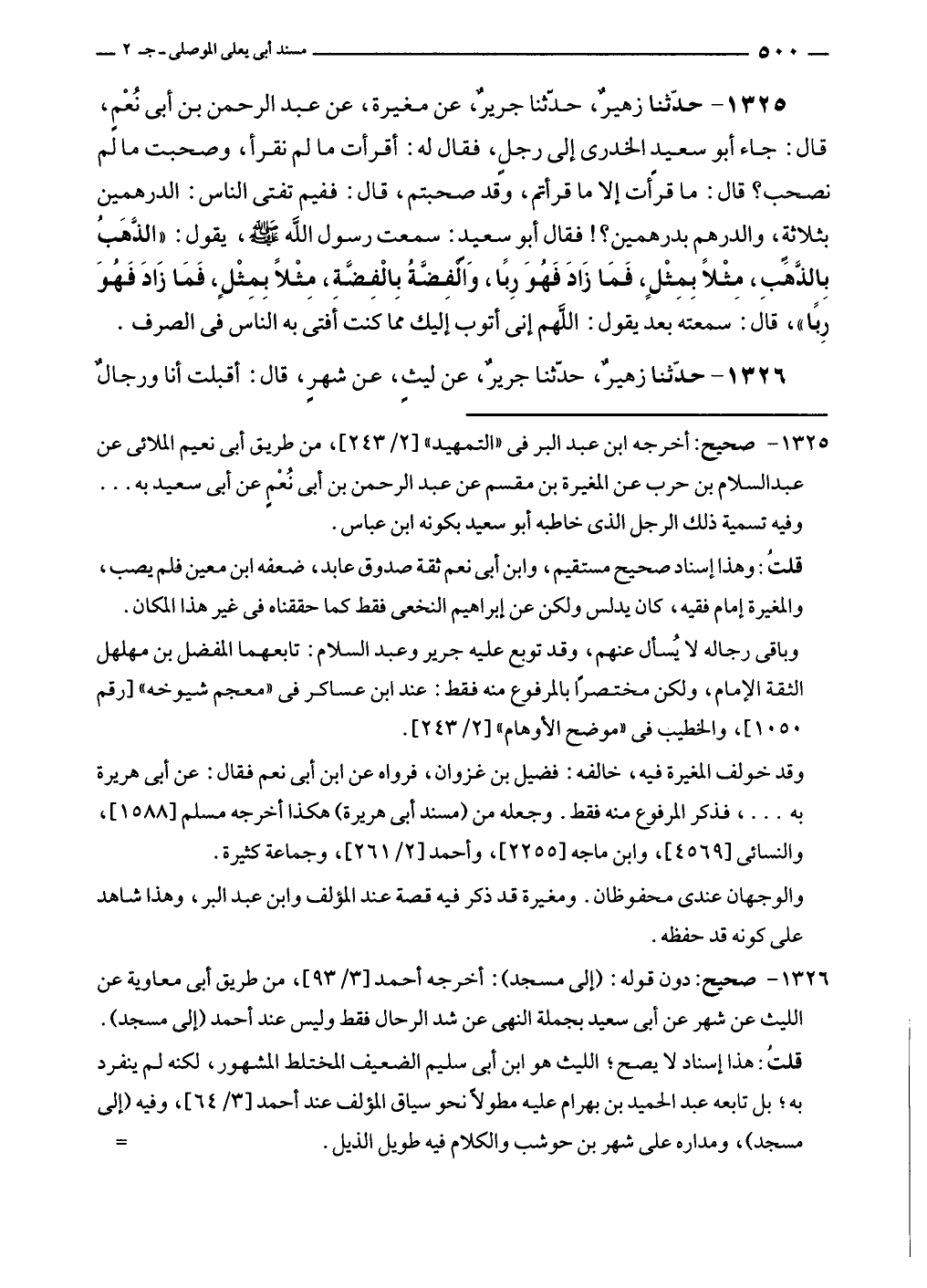 ١٣٢٥ - حدّثنا زهير، حدّثنا جرير، عن مغيرة، عن عبد الرحمن بن أبي نُعْمٍ، قال: جاء أبو سعيدٍ الخدرى إلى رجل، فقال له: أقرأت ما لم نقرأ، وصحبت ما لم نصحب؟ قال: ما قرأت إلا ما قرأتم، وقد صحبتم، قال: ففيم تفتى الناس: الدرهمين بثلاثةٍ، والدرهم بدرهمين؟! فقال أبو سعيد: سمعت رسول الله - صلى الله عليه وسلم -، يقول: "الذَّهَبُ بِالذَّهَبِ، مِثْلًا بِمِثْلٍ، فَمَا زَادَ فَهُوَ رِبًا، وَالْفِضَّةُ بِالْفِضَّةِ، مِثْلًا بِمِثْلٍ، فَمَا زَادَ فَهُوَ رِبًا"، قال: سمعته بعد يقول: اللَّهم إنى أتوب إليك مما كنت أفتى به الناس في الصرف.