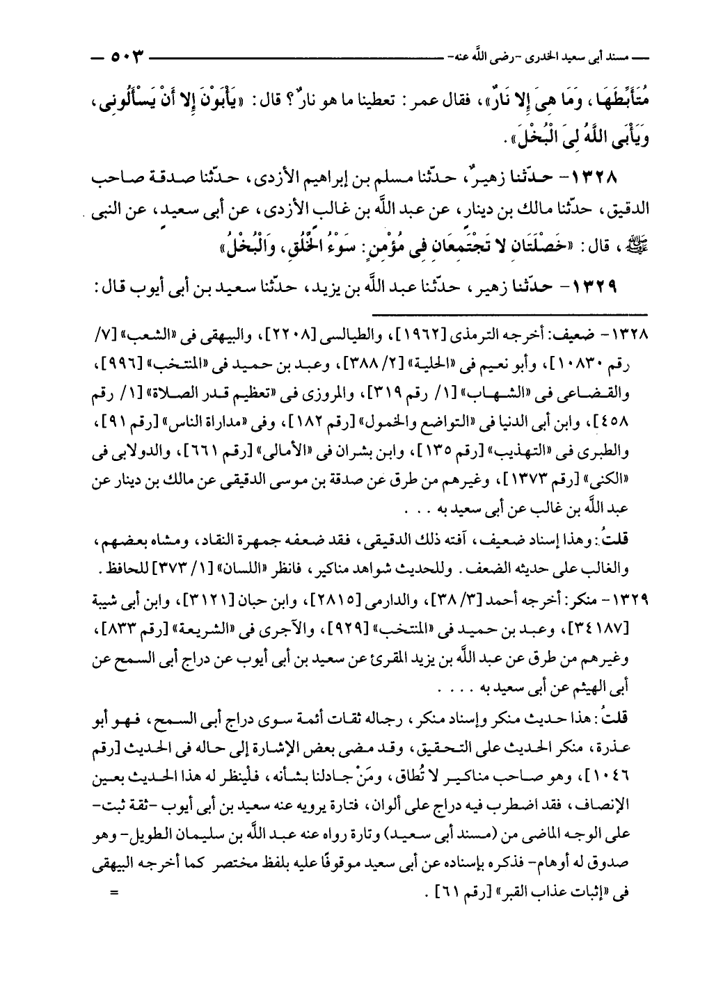 ١٣٢٩ - منكر: أخرجه أحمد [٣/ ٣٨]، والدارمى [٢٨١٥]، وابن حبان [٣١٢١]، وابن أبي شيبة [٣٤١٨٧]، وعبد بن حميد في "المنتخب" [٩٢٩]، والآجرى في "الشريعة" [رقم ٨٣٣]، وغيرهم من طرق عن عبد الله بن يزيد المقرئ عن سعيد بن أبي أيوب عن دراج أبي السمح عن أبي الهيثم عن أبي سعيد به ....