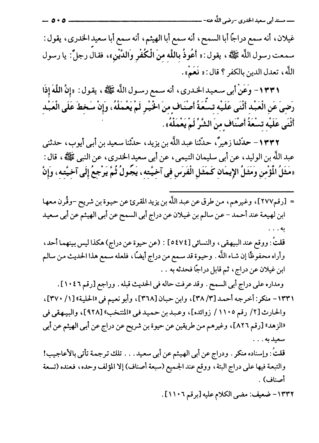 ١٣٣١ - منكر: أخرجه أحمد [٣/ ٣٨]، وابن حبان [٣٦٨]، وأبو نعيم في "الحلية" [١/ ٣٧٠]، والحارث [٢ / رقم ١١٠٥ / زوائده]، وعبد بن حميد في "المنتخب" [٩٢٨]، والبيهقى في "الزهد" [رقم ٨٢٦]، وغيرهم من طريقين عن حيوة بن شريح عن دراج عن أبي الهيثم عن أبي سعيد به ...
