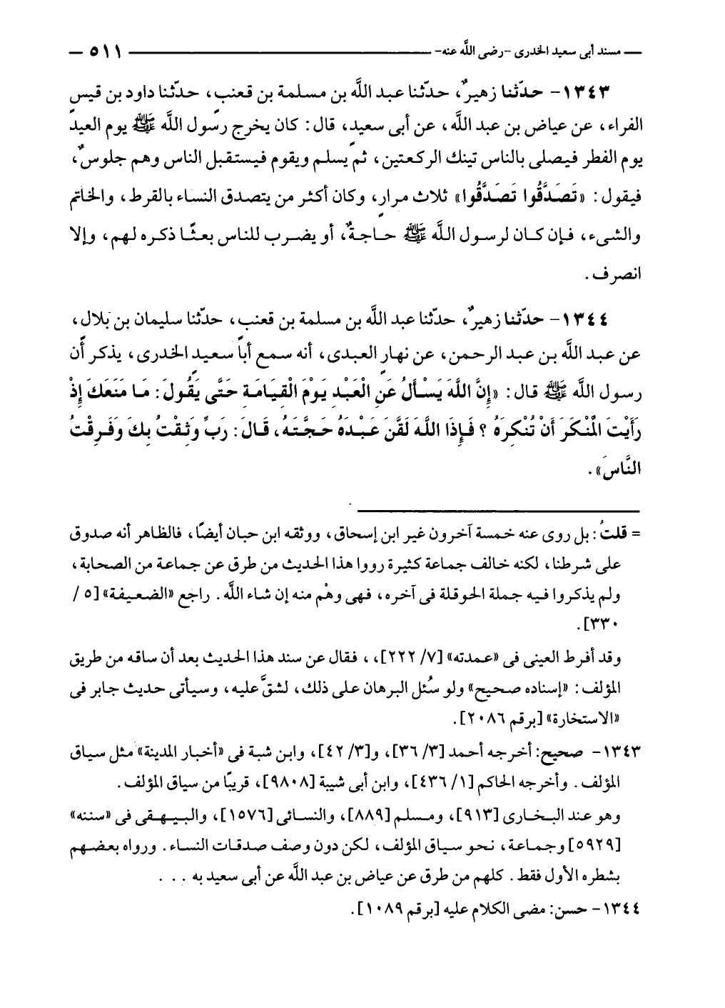 ١٣٤٣ - حدّثنا زهير، حدّثنا عبد الله بن مسلمة بن قعنبٍ، حدّثنا داود بن قيسٍ الفراء، عن عياض بن عبد الله، عن أبي سعيدٍ، قال: كان يخرج رسول الله - صلى الله عليه وسلم - يوم العيد يوم الفطر فيصلى بالناس تينك الركعتين، ثم يسلم ويقوم فيستقبل الناس وهم جلوسٌ، فيقول: "تَصَدَّقُوا تَصَدَّقُوا" ثلاث مرارٍ، وكان أكثر من يتصدق النساء بالقرط، والخاتم والشئ، فإن كان لرسول الله - صلى الله عليه وسلم - حاجة، أو يضرب للناس بعثًا ذكره لهم، وإلا انصرف.
