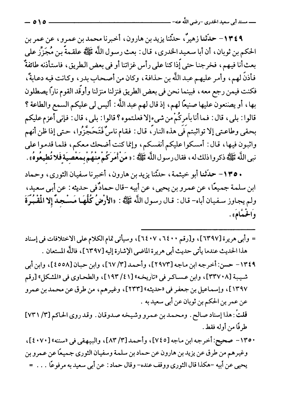 ١٣٥٠ - حدّثنا أبو خيثمة، حدّثنا يزيد بن هارون، أخبرنا سفيان الثورى، وحماد بن سلمة جميعًا، عن عمرو بن يحيى، عن أبيه - قال حمادٌ في حديثه: عن أبي سعيدٍ، ولم يجاوز سفيان أباه - قال: قال رسول الله - صلى الله عليه وسلم -: "الأَرْضُ كُلُّهَا مَسْجِدٌ إِلا المقْبُرَةَ وَالحمَّامَ".