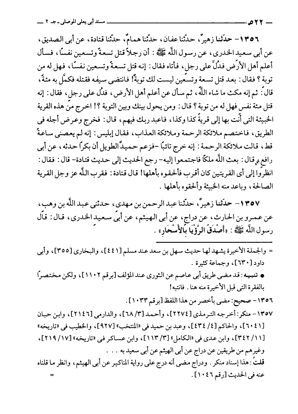 ١٣٥٦ - حدّثنا زهيرٌ، حدّثنا عفان، حدّثنا همامٌ، حدّثنا قتادة، عن أبي الصديق، عن أبي سعيدٍ الخدرى، عن رسول الله - صلى الله عليه وسلم -: أن رجلًا قتل تسعةً وتسعين نفسًا، فسأل أعلم أهل الأرض فدُلَّ على رجلٍ، فأتاه فقال: إنه قتل تسعةً وتسعين نفسًا، فهل له من توبةٍ؟ فقال: بعد قتل تسعة وتسعين ليست لك توبةٌ! فانتضى سيفه فقتله فكمَّل به مئةً، قال: ثم إنه مكث ما شاء الله، ثم سأل عن أعلم أهل الأرض، فدُل على رجلٍ، فقال: إنه قتل مئة نفسٍ فهل له من توبةٍ؟ قال: ومن يحول بينك وبين التوبة؟! اخرج من هذه القرية الخبيثة التى أنت بها إلى قرية كذا وكذا، فاعبد ربك فيهم، قال: فخرج وعرض أجله في الطريق، فاختصم ملائكة الرحمة وملائكة العذاب، فقال إبليس: إنه لم يعصنى ساعةً قط، قالت ملائكة الرحمة: إنه خرج تائبًا - فزعم حميدٌ الطويل أن بكرًا حدثه، عن أبي رافعٍ، قال: بعث الله ملكًا فاجتمعوا إليه - رجع الحديث إلى حديث قتادة - قال: فقال: انظروا إلى أي القريتين كان أقرب فألحقوه بأهلها! قال قتادة: فقرب الله عز وجل القرية الصالحة، وباعد منه الخبيثة وألحقوه بأهلها.