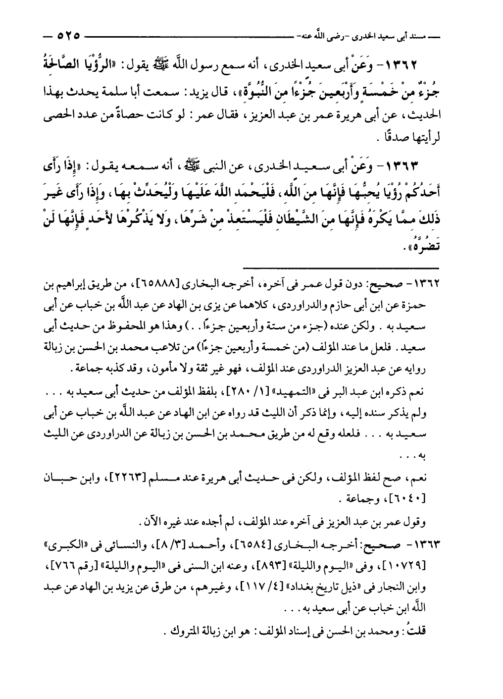 ١٣٦٢ - وَعَنْ أبي سعيدٍ الخدرى، أنه سمع رسول الله - صلى الله عليه وسلم - يقول: "الرُّؤْيَا الصَّالحِةُ جُزْءٌ مِنْ خَمْسَةٍ وَأَرْبَعِينَ جُزْءًا مِنَ النُّبُوَّة"، قال يزيد: سمعت أبا سلمة يحدث بهذا الحديث، عن أبي هريرة عمر بن عبد العزيز، فقال عمر: لو كانت حصاةً من عدد الحصى لرأيتها صدقًا.