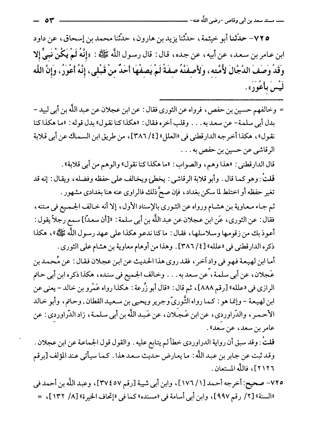 أما ابن لهيعة فهو في وادٍ آخر، فقد روى هذا الحديث عن ابن عجلان فقال: عن مُحمد بن عَجلان، عن أبي سلمة، عن سعد به ... وخالف الجميع في سنده، هكذا ذكره ابن أبي حاتم الرازي في "علله" [رقم ٨٨٨]، ثم قال: "قال أبو زُرعة: هكذا رواه عَمْرو بن خالد - يعنى عن ابن لهيعة - وإنما هو: كما رواه الثَّوريّ وجرير ويحيى بن سعيد القطان، وحاتم، وأبو خالد الأحمر، والدّراوردي، عن ابن عَجَلان، عن عَبد الله بن أبي سلمة، زاد الدّراوردي: عن عامر بن سعد، عن سَعد".