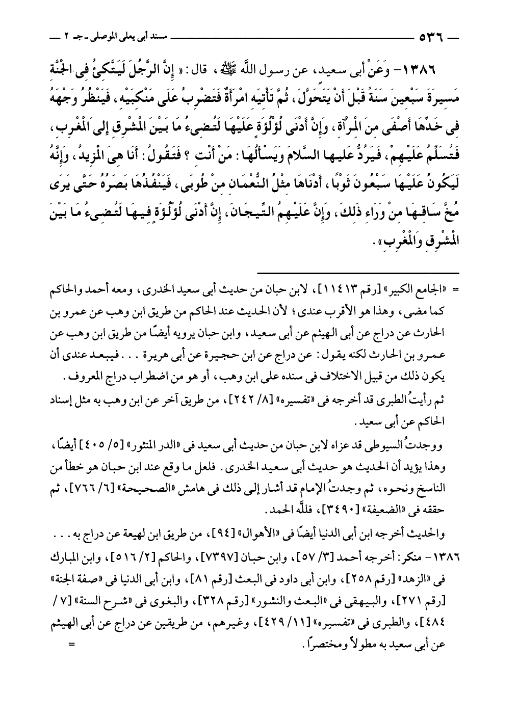١٣٨٦ - منكر: أخرجه أحمد [٣/ ٥٧]، وابن حبان [٧٣٩٧]، والحاكم [٢/ ٥١٦]، وابن المبارك في "الزهد" [رقم ٢٥٨]، وابن أبي داود في البعث [رقم ٨١]، وابن أبي الدنيا في "صفة الجنة" [رقم ٢٧١]، والبيهقى في "البعث والنشور" [رقم ٣٢٨]، والبغوى في "شرح السنة" [٧/ ٤٨٤]، والطبرى في "تفسيره" [١١/ ٤٢٩]، وغيرهم، من طريقين عن دراج عن أبي الهيثم عن أبي سعيد به مطولًا ومختصرًا. =