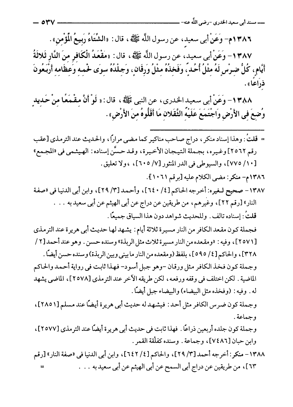 ١٣٨٧ - وَعَنْ أبي سعيدٍ، عن رسول الله - صلى الله عليه وسلم -، قال: "مقْعَدُ الْكَافِرِ مِنَ النَّارِ ثَلاثَةُ أَيَّامٍ، كُلُّ ضِرْسٍ لَهُ مِثْلُ أُحُدٍ، وَفَخِذُهُ مِتْلُ وَرِقَانٍ، وَجِلْدُهُ سِوَى لحْمِهِ وَعِظَامِهِ أَرْبَعُونَ ذِرَاعًا".