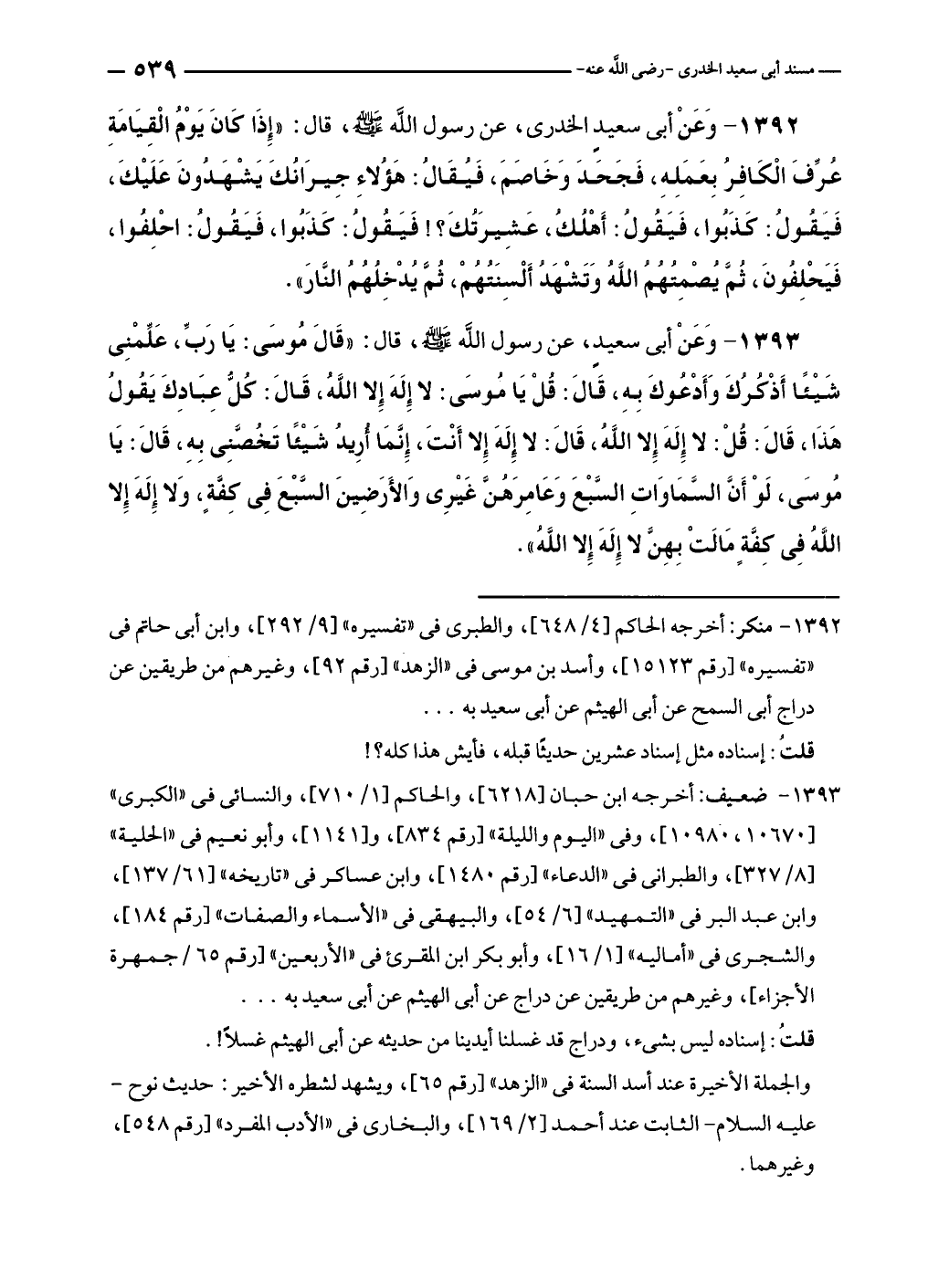 ١٣٩٢ - منكر: أخرجه الحاكم [٤/ ٦٤٨]، والطبرى في "تفسيره" [٩/ ٢٩٢]، وابن أبي حاتم في "تفسيره" [رقم ١٥١٢٣]، وأسد بن موسى في "الزهد" [رقم ٩٢]، وغيرهم من طريقين عن دراج أبي السمح عن أبي الهيثم عن أبي سعيد به ...