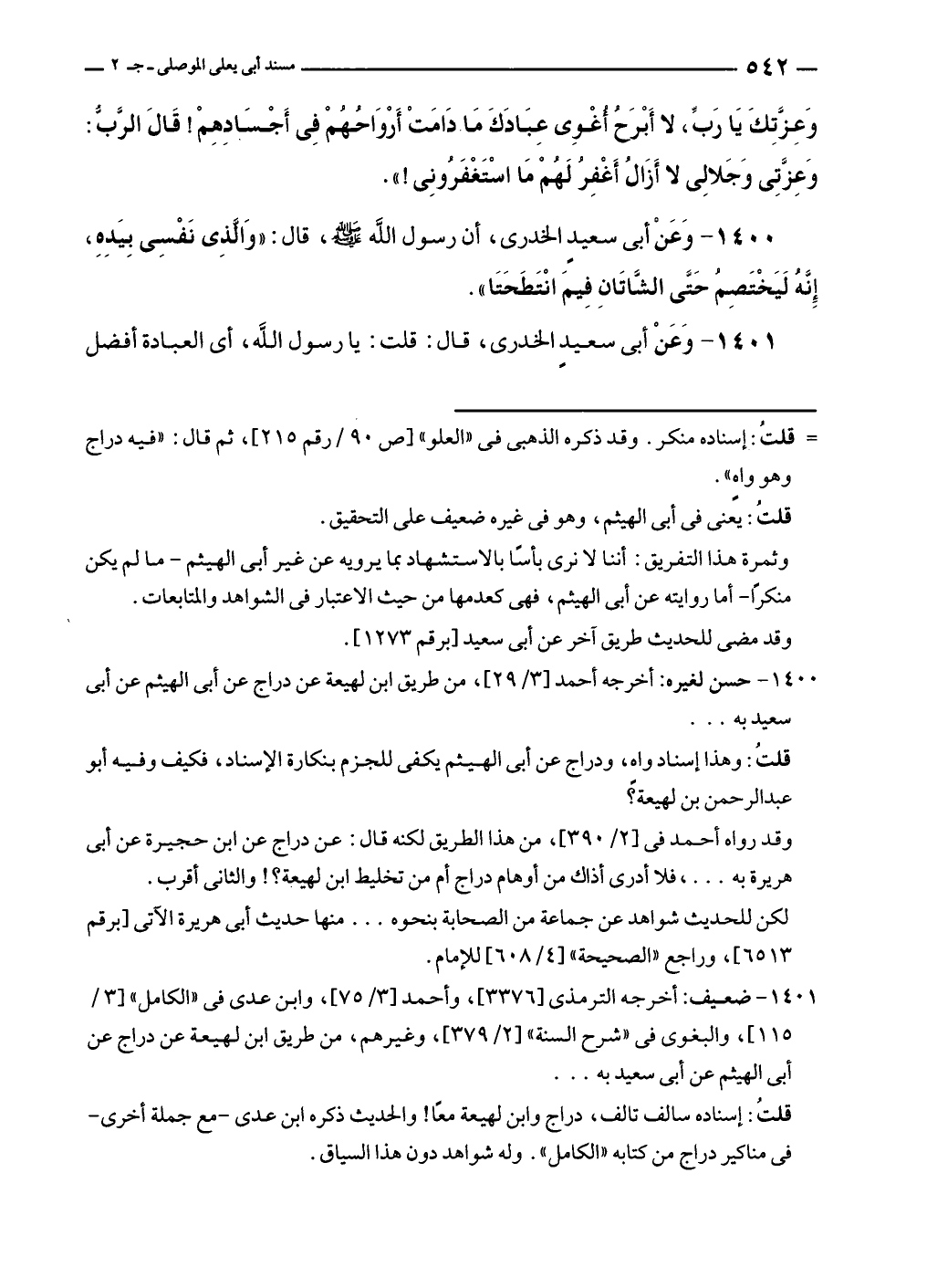 ١٤٠١ - ضعيف: أخرجه الترمذى [٣٣٧٦]، وأحمد [٣/ ٧٥]، وابن عدى في "الكامل" [٣/ ١١٥]، والبغوى في "شرح السنة" [٢/ ٣٧٩]، وغيرهم، من طريق ابن لهيعة عن دراج عن أبي الهيثم عن أبي سعيد به ...